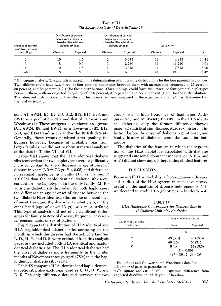 We have histocompatibility (HLA) genotyped 24 families with two or more juvenile, insulin-dependent, ketosis-prone diabetic siblings. This criterion for family selection was used to obtain a homogeneous form of diabetes within a sibship, because diabetes appears to be a genetically heterogeneous disease. 58 diabetic and 53 nondiabetic sibs and 40 parents were studied. 55% of the diabetic pairs were concordant for both HLA haplotypes (expected 25%), 40% were concordant for one haplotype (expected 50%), and 5% were discordant for both haplotypes (expected 25%). These values are significantly different from the expected values (P < 0.001). On the other hand, the inheritance of haplotypes among the nondiabetic sibs in these families was not significantly different from the expected mendelian segregation.