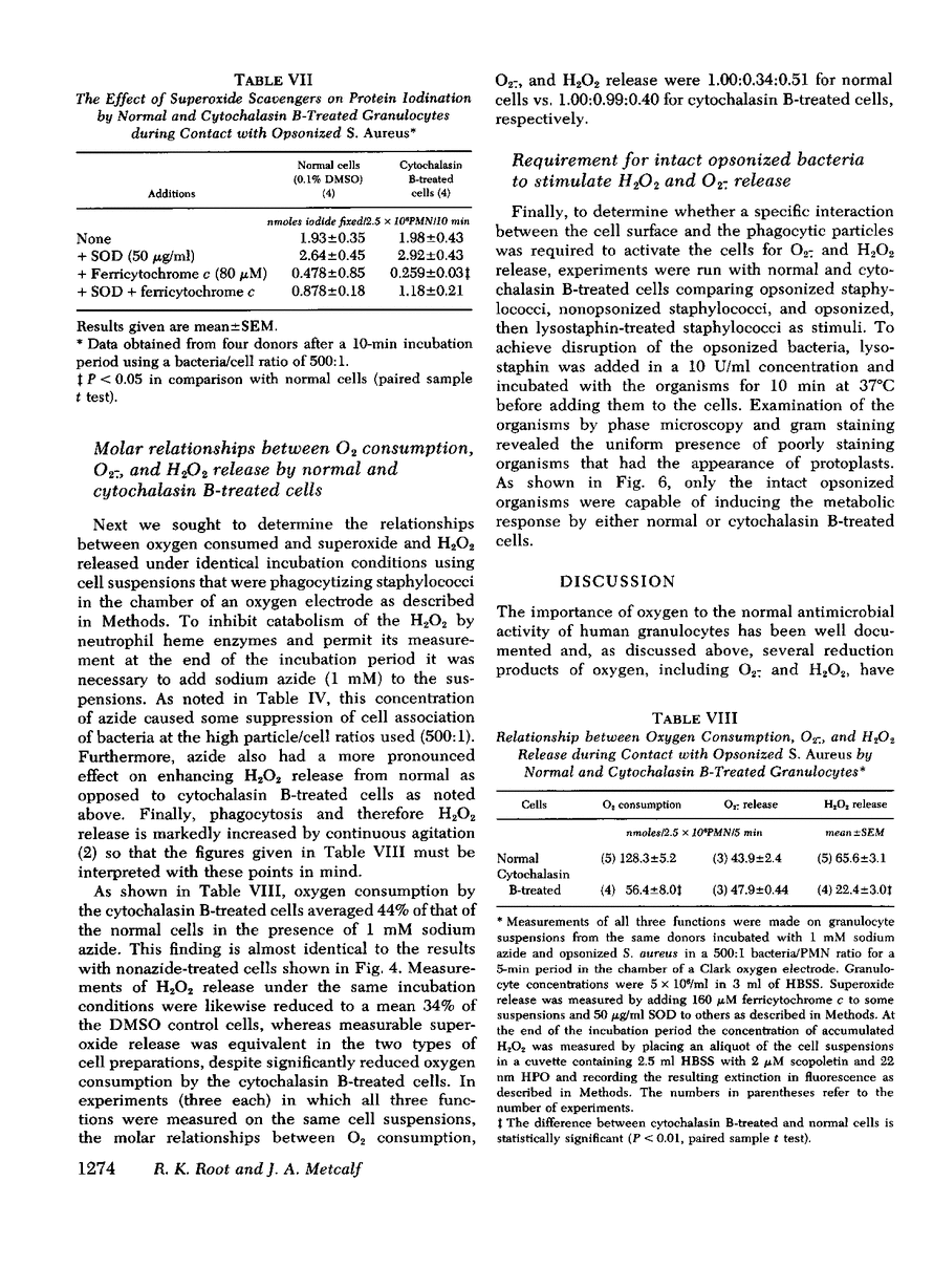 Normal and cytochalasin B-treated human granulocytes have been studied to determine some of the interrelationships between phagocytosis-induced respiration and superoxide and hydrogen peroxide formation and release into the extracellular medium by intact cells. By using the scopoletin fluorescent assay to continuously monitor extracellular hydrogen peroxide concentrations during contact of cells with opsonized staphylococci, it was demonstrated that the superoxide scavengers ferricytochrome c and nitroblue tetrazolium significantly reduced the amount of H2O2 released with time from normal cells but did not abolish it. This inhibitory effect was reversed by the simultaneous addition of superoxide dismutase (SOD), whereas the addition of SOD alone increased the amount of detectable H2O2 in the medium. The addition of sodium azide markedly inhibited myeloperoxidase-H2O2-dependent protein iodination and more than doubled H2O2 release, including the residual amount remaining after exposure of the cells to ferricytochrome c, suggesting its origin from an intracellular pool shared by several pathways for H2O2 catabolism.