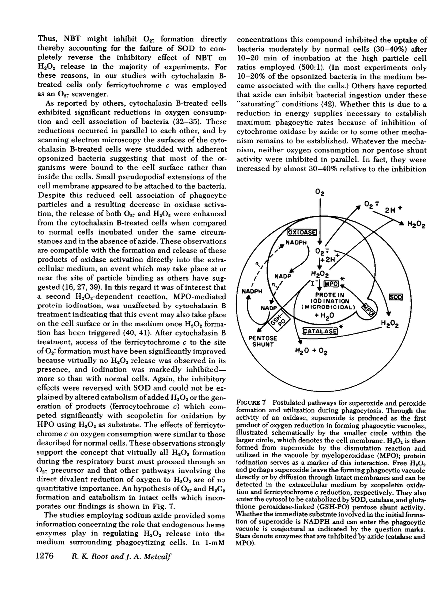 Normal and cytochalasin B-treated human granulocytes have been studied to determine some of the interrelationships between phagocytosis-induced respiration and superoxide and hydrogen peroxide formation and release into the extracellular medium by intact cells. By using the scopoletin fluorescent assay to continuously monitor extracellular hydrogen peroxide concentrations during contact of cells with opsonized staphylococci, it was demonstrated that the superoxide scavengers ferricytochrome c and nitroblue tetrazolium significantly reduced the amount of H2O2 released with time from normal cells but did not abolish it. This inhibitory effect was reversed by the simultaneous addition of superoxide dismutase (SOD), whereas the addition of SOD alone increased the amount of detectable H2O2 in the medium. The addition of sodium azide markedly inhibited myeloperoxidase-H2O2-dependent protein iodination and more than doubled H2O2 release, including the residual amount remaining after exposure of the cells to ferricytochrome c, suggesting its origin from an intracellular pool shared by several pathways for H2O2 catabolism.