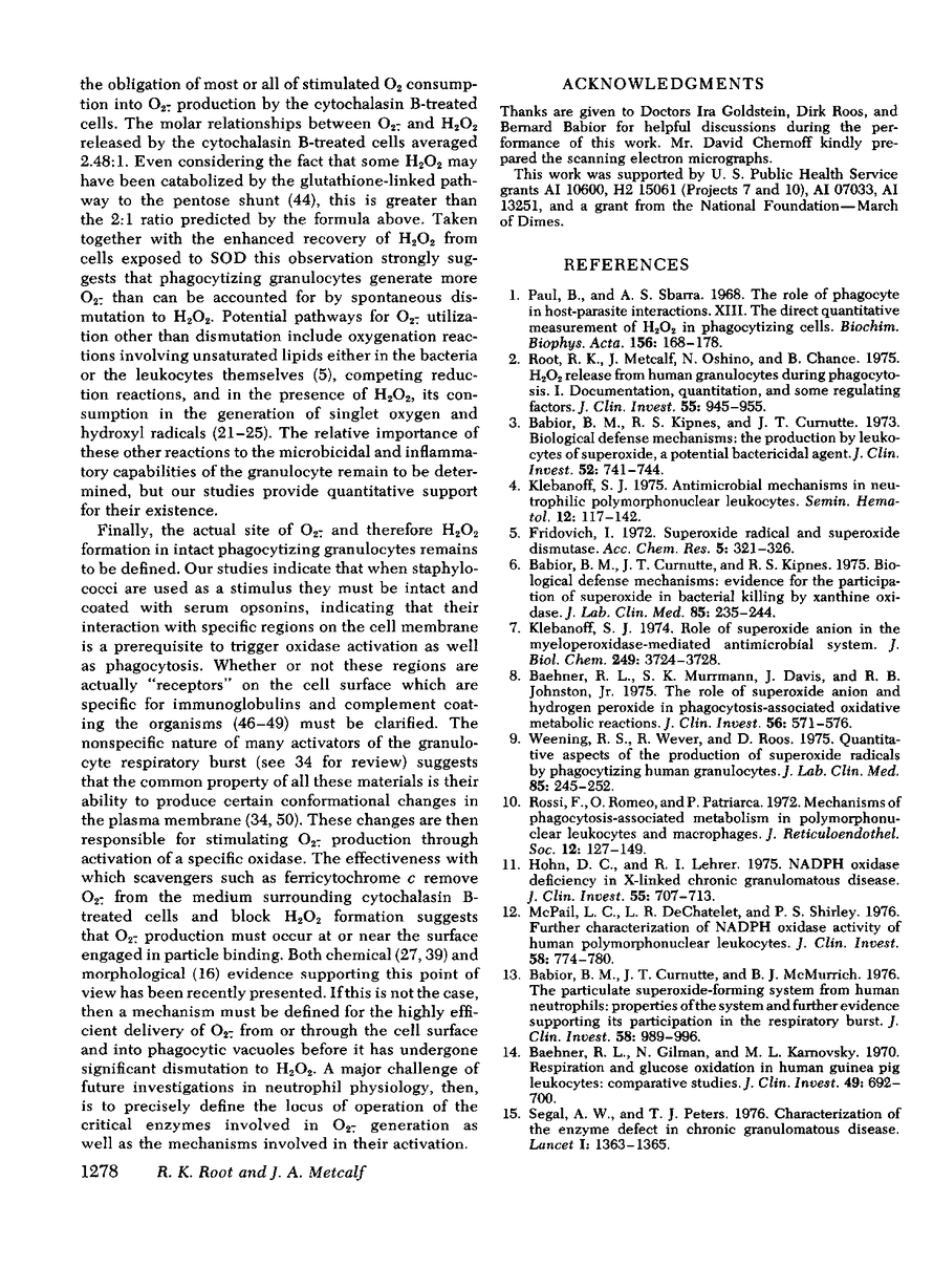 Normal and cytochalasin B-treated human granulocytes have been studied to determine some of the interrelationships between phagocytosis-induced respiration and superoxide and hydrogen peroxide formation and release into the extracellular medium by intact cells. By using the scopoletin fluorescent assay to continuously monitor extracellular hydrogen peroxide concentrations during contact of cells with opsonized staphylococci, it was demonstrated that the superoxide scavengers ferricytochrome c and nitroblue tetrazolium significantly reduced the amount of H2O2 released with time from normal cells but did not abolish it. This inhibitory effect was reversed by the simultaneous addition of superoxide dismutase (SOD), whereas the addition of SOD alone increased the amount of detectable H2O2 in the medium. The addition of sodium azide markedly inhibited myeloperoxidase-H2O2-dependent protein iodination and more than doubled H2O2 release, including the residual amount remaining after exposure of the cells to ferricytochrome c, suggesting its origin from an intracellular pool shared by several pathways for H2O2 catabolism.