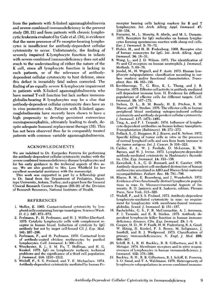 To gain insight into a possible role for antibody-dependent cell-mediated cytotoxicity in vivo, we examined the ability of leukocytes from 28 patients with primary immunodeficiency and from 20 normal controls to lyse three different types of antibody-coated targets in vitro. Mean cytotoxic indices ±1 SD elicited by unfractionated mononuclear cells from normal controls were 28.74±13.26 for human HLA antibody-coated lymphocyte targets, 42.79±8.27 for rabbit IgG antibody-coated chicken erythrocyte targets, and 47.58±10.34 for human anti-CD (Ripley)-coated O+ erythrocyte targets. Significantly (P=<0.05) lower than normal mean cytotoxic indices against lymphocyte targets were seen with effector cells from 10 patients with X-linked agammaglobulinemia (3.7±4.33), in 10 with common variable agammaglobulinemia (16.05±7.74), in 3 with immunodeficiency with hyper IgM (18.41±4.88), and in 2 with severe combined immunodeficiency (3.94±0.3). Antibody-dependent cytotoxicity against chicken erythrocytes was significantly (P=<0.05) lower than normal only in the common variable agammaglobulinemic group (33.33±12.3) and against human erythrocytes only in the common variable (34.36±9.59) and hyper IgM (27.54±0.66) groups. Rosette and anti-F(ab′)2 depletion studies with normal leukocytes indicated that a nonadherent, nonphagocytic, non-Ig-bearing, non-C receptor-bearing, Fc receptor-bearing lymphocyte was the only effector capable of lysing HLA antiboyd-coated lymphocyte targets. Patients with infantile X-linked agammaglobulinemia and severe combined immunodeficiency appear to have a marked deficiency in this type of effector cell function.
