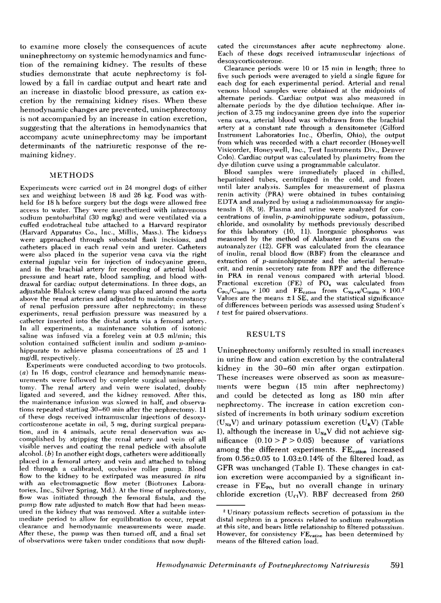 Studies were carried out in anesthetized dogs to characterize the increase in cation excretion which occurs after acute unilateral nephrectomy (AUN). 60 min after AUN, cation excretion had increased from 31.5±2.7 to 66.3±12.0 μeq/min (P < 0.005) and fractional cation excretion had increased from 0.56±0.05 to 1.03±0.14% (P < 0.005), as the glomerular filtration rate was unchanged and renal blood flow fell. The increased cation excretion was accompanied by an increase in fractional phosphate excretion, no change in chloride excretion, and a fall in renin secretion. These alterations in renal function were associated with marked changes in systemic hemodynamics: cardiac output fell from 2.52±0.24 to 1.85±0.16 liters/min (P < 0.001), as diastolic pressure rose without an overall increase in mean arterial pressure, and heart rate fell.