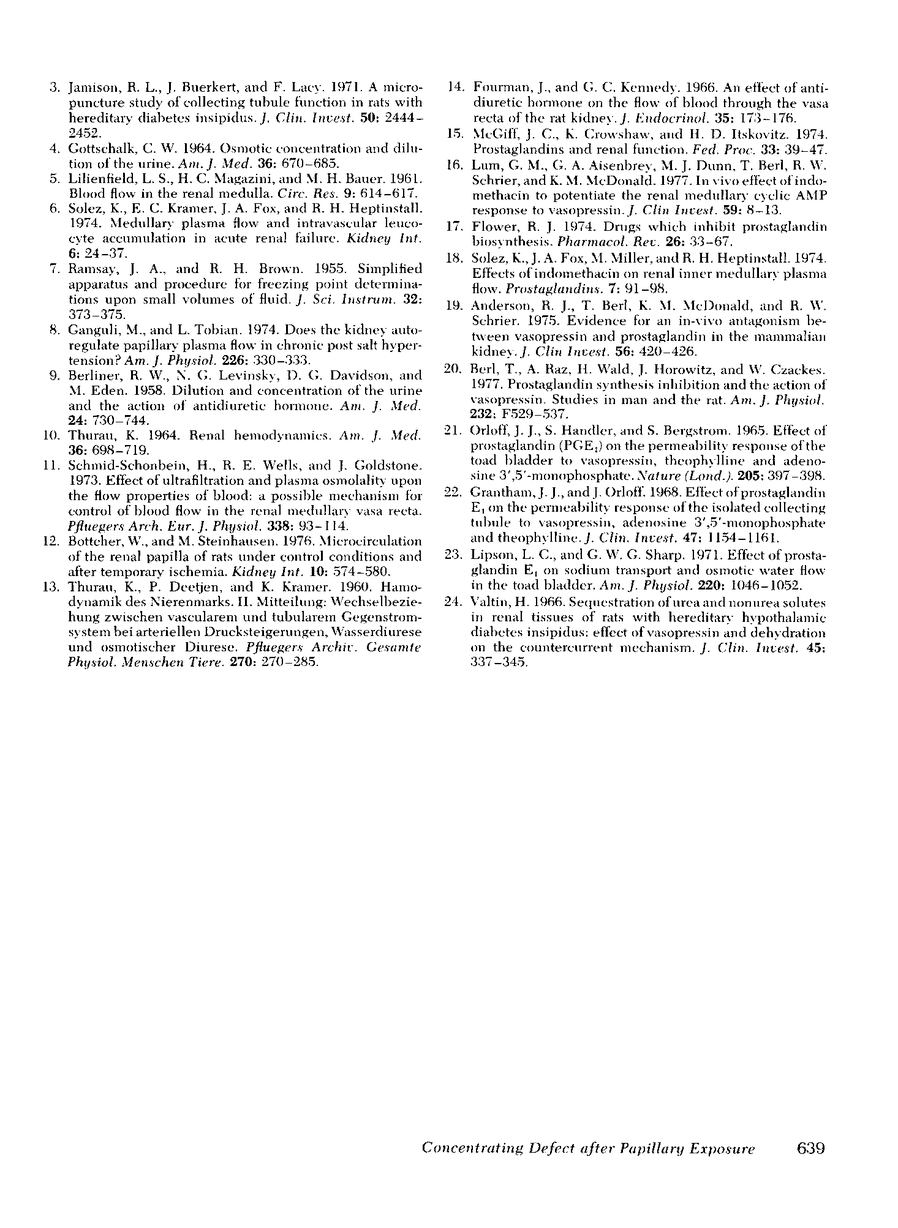Studies were performed in Munich-Wistar rats to determine whether changes in papillary plasma flow might be responsible for the concentrating defect which occurs after exposure of the extrarenal papilla. Papillary plasma flow was measured by 125I-albumin accumulation. Initial studies in hydropenic animals revealed that papillary plasma flow was 40% higher in the kidney with the exposured papilla, 41 vs. 29 ml/min per 100 g of papilla (P < 0.001). This increase in papillary plasma flow was detectable 15 or 45 min after removing the ureter. Because it was unclear whether the rise in papillary plasma flow was a cause or the result of the fall in urine osmolality, similar studies were performed in animals undergoing a water diuresis. In this setting, papillary plasma flow still increased on the exposed side compared to the control side, 81 vs. 60 ml/min per 100 g, despite similarly low urine osmolalities of 155 and 174 mosmol/kg, respectively. This finding is compatible with the possibility that papillary exposure per se causes an increase in papillary plasma flow and that this hemodynamic alteration may lead to a reduction in urinary osmolality secondary to washout of the medullary interstitium. A final group of hydropenic rats was given either indomethacin or meclofenamate before removing the ureter. In these studies, there was no difference in either the papillary plasma flow or the urine osmolality between control and exposed kidneys. It is therefore suggested that opening the ureter induces an increase in papillary plasma flow by some mechanism which may involve an alteration in prostaglandin synthesis.