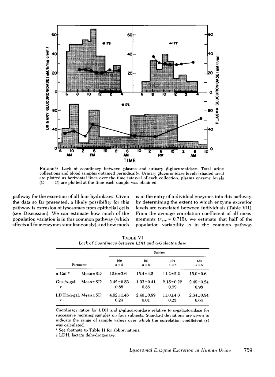 Assay conditions have been developed for the determination of urinary beta-glucuronidase, beta-galactosidase, alpha-galactosidase, and beta-hexosaminidase using fluorometric substrates. The assay conditions for beta-glucuronidase overcome interference by both low and high molecular weight inhibitors, a problem that has confused earlier studies of enzyme excretion. The four lysosomal enzymes are excreted corrdinately: although their absolute levels (in units per milligram of creatinine) vary during the day and from one day to the next, the ratio of one enzyme to another remains relatively constant. The lack of correlation betweem plasma and urine enzyme levels, together with the high molecular weights of these enzymes, suggests that the urinary enzymes are not derived by glomerular filtration. The lack of coordinacy with lactate dehydrogenase suggests they are not derived from exfoliated cells. by analogy with experimental animals, they may be derived from lysosomes extruded into the lumen of the proximal tubule by epithelial cells. There is considerable variation among a population of 125 healthy adult subjects for total enzyme excretion. Both total enzyme excretion and coordinacy ratios are log-normally distributed, suggesting that they are the resultants of many factors, each of which has a relative, or proportional, effect on enzyme excretion. About one-half the population variation resides in a process common to the excretion of all four enzymes (possibly the lysosome extrusion pathway), and about one-half resides in factors affecting each enzyme independently.