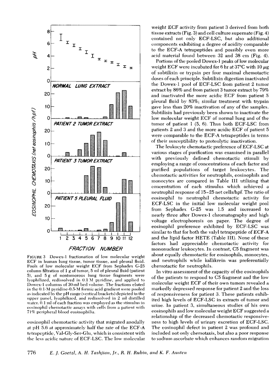 A peptide of approximately 300-400 daltons exhibiting in vitro chemotactic activity for human polymorphonuclear (PMN) leukocytes, with a preference for the eosinophil series, was isolated from extracts of anaplastic lung carcinomas of the large squamous cell type obtained from three patients with marked peripheral blood hypereosinophilia and eosinophilic infiltration of the tumors and surrounding normal pulmonary tissues. This chemotactic factor was termed ECF-LSC (eosinophil chemotactic factor of lung squamous cell carcinoma). ECF-LSC appeared in the urine of two of the patients in increasing quantities late in the course of their disease and was also elaborated by long-term cultures of dispersed tumor cells from the same two patients. Three anaplastic large cell bronchogenic carcinomas which were not associated with tumor tissue or peripheral blood eosinophilia, a bronchogenic adenocarcinoma from a patient with only peripheral eosinophilia, and a renal cell carcinoma metastatic to the lungs and associated with transient pleural tissue and fluid eosinophilia were all devoid of ECF-LSC. ECF-LSC from tumor tissue extracts, urine, and tumor cell culture medium was comparable to the mast cell-associated tetrapeptides of the eosinophil chemotactic factor of anaphylaxis (ECF-A) in size, but eluted from Dowex-1 at pH 5.0-3.5 in contrast to the more acidic ECF-A tetrapeptides which eluted at pH 3.2-2.2 ECF-LSC, like the tetrapeptides of ECF-A, had a secondary chemotactic activity for neutrophil PMN leukocytes, but not mononuclear leukocytes, and deactivated both eosinophil and neutrophil PMN leukocytes so that they would not respond to a subsequent in vitro chemotactic stimulus. Eosinophils from the two patients with urinary excretion of ECF-LSC and the highest concentrations in tumor extracts were hyporesponsive in vitro to homologous and heterologous chemotactic stimuli, suggesting that ECF-LSC had deactivated the eosinophils in vivo.