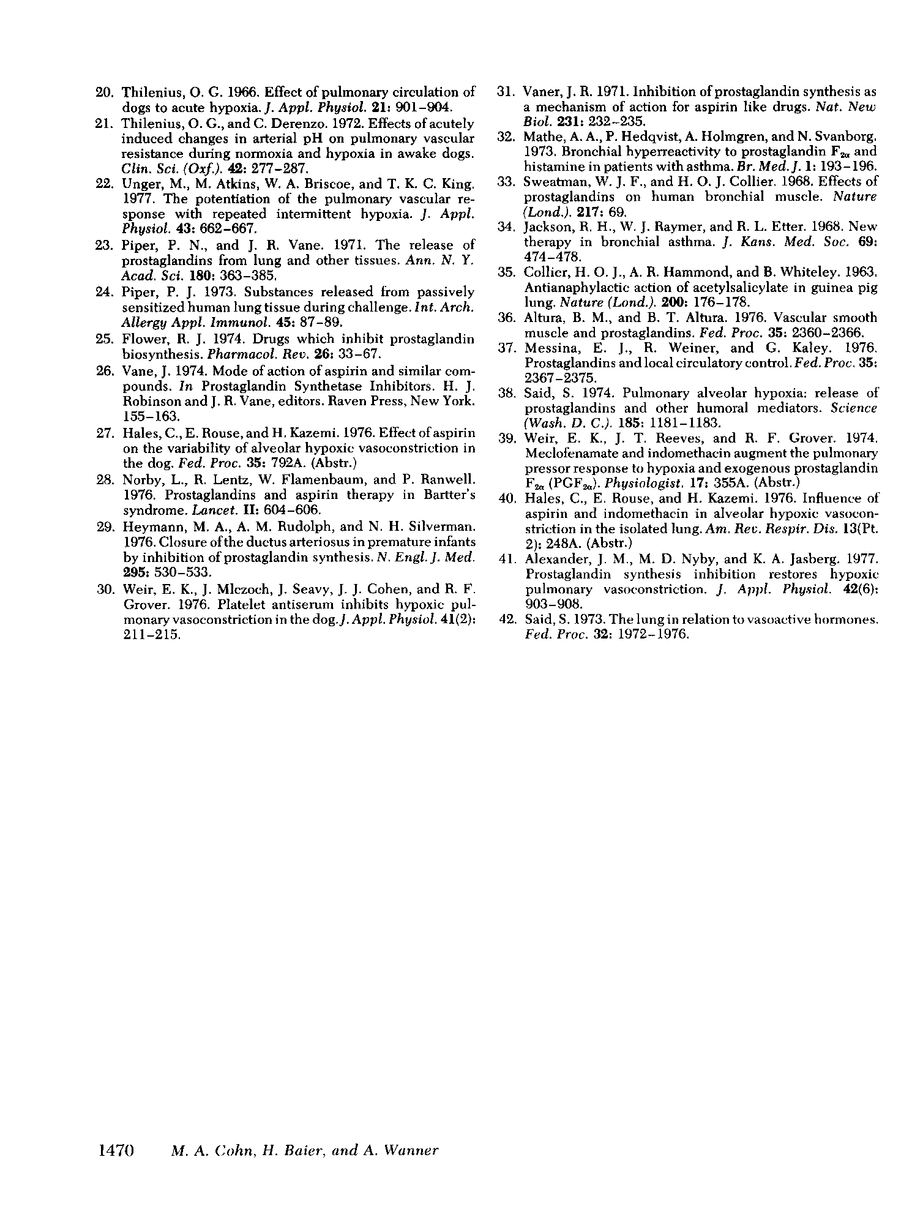 Measurements of respiratory mechanics, arterial blood gases, and pulmonary vascular resistance were made before and 15 min after inhalation challenge with Ascaris suum extract in dogs with natural sensitivity to this antigen. 25 of 47 dogs were treated before inhalation challenge with a prostaglandin inhibitor (90 mg/kg of aspirin or 2 mg/kg of indomethacin by intravenous infusion). In response to the challenge, bronchospasm developed in approximately half (responders) of each group reflected by decreases in mean specific respiratory system conductance and arterial oxygen tension. While the dogs were breathing room air, pulmonary vascular resistance remained unchanged after antigen challenge in the responders not given aspirin or indomethacin, but increased significantly and was associated with a lesser degree of arterial hypoxemia in the responders pretreated with either of the prostaglandin inhibitors. Prevention of arterial hypoxemia by oxygen breathing blocked an increase in pulmonary vascular resistance in four pretreated responders. No changes in respiratory mechanics, pulmonary hemodynamics, or arterial blood gases were noted in the 21 dogs who did not develop bronchospasm regardless of whether or not they were pretreated. 12 additional dogs in whom arterial hypoxemia was produced by 10% oxygen breathing, showed an increase in pulmonary vascular resistance that was not potentiated by pretreatment with aspirin in 6. We conclude that in acute experimental canine asthma, vasodilator prostaglandins appear to blunt the hypoxic pulmonary vasoconstrictor response, thereby further compromising gas exchange but preventing the development of pulmonary hypertension.