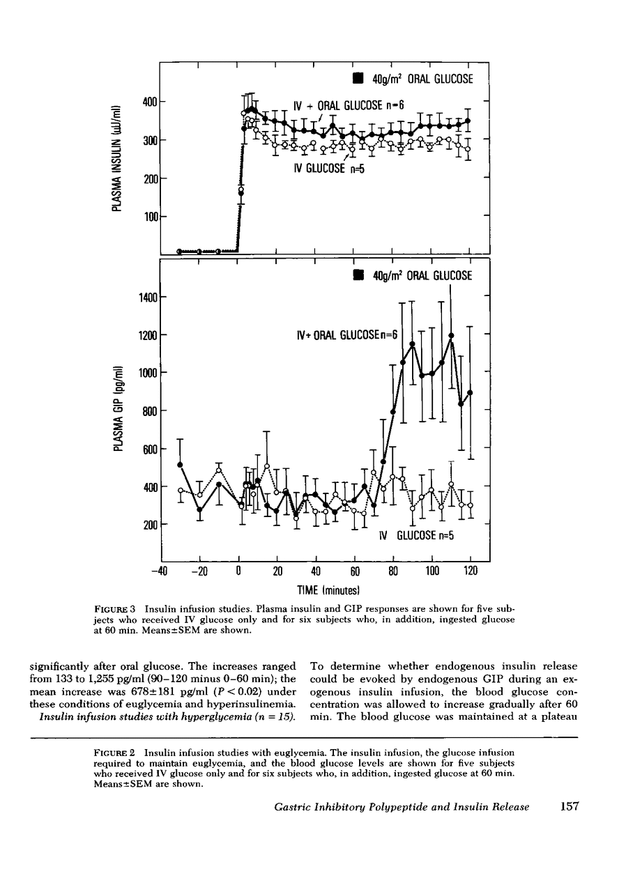 Gastric inhibitory polypeptide, or GIP, has been postulated as the major enteric hormonal mediator of insulin release. The release of immuno-reactive GIP (IR-GIP) after oral glucose and its role in insulin release was studied in normal men by the glucose clamp technique. In 24 subjects studied with the hyperglycemic clamp, blood glucose was maintained at 125 mg/dl above basal for 2 h via a primed-continuous IV glucose infusion coupled to a servo-controlled negative feedback system. 40 g glucose per m2 surface area was ingested at 60 min, and the blood glucose was maintained at the steady-state hyperglycemic level. Plasma IR-GIP and insulin (IRI) levels were measured throughout the 2-h period. IR-GIP levels changed little when IV glucose alone was given; the mean basal value was 305±34 (SEM) pg/ml. After oral glucose, IR-GIP levels began to rise within 10 min and reached a peak within 40 min of 752±105 pg/ml. Plasma IRI responded initially to the square wave of hyperglycemia in the typical biphasic pattern. After oral glucose, plasma IRI levels rose strikingly above the elevated levels produced by hyperglycemia alone, reaching a peak of 170±15 μU/ml within 45 min. The time course of the rise in IR-GIP and IRI was nearly identical.