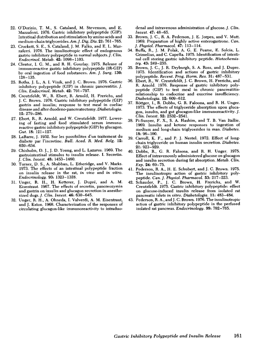 Gastric inhibitory polypeptide, or GIP, has been postulated as the major enteric hormonal mediator of insulin release. The release of immuno-reactive GIP (IR-GIP) after oral glucose and its role in insulin release was studied in normal men by the glucose clamp technique. In 24 subjects studied with the hyperglycemic clamp, blood glucose was maintained at 125 mg/dl above basal for 2 h via a primed-continuous IV glucose infusion coupled to a servo-controlled negative feedback system. 40 g glucose per m2 surface area was ingested at 60 min, and the blood glucose was maintained at the steady-state hyperglycemic level. Plasma IR-GIP and insulin (IRI) levels were measured throughout the 2-h period. IR-GIP levels changed little when IV glucose alone was given; the mean basal value was 305±34 (SEM) pg/ml. After oral glucose, IR-GIP levels began to rise within 10 min and reached a peak within 40 min of 752±105 pg/ml. Plasma IRI responded initially to the square wave of hyperglycemia in the typical biphasic pattern. After oral glucose, plasma IRI levels rose strikingly above the elevated levels produced by hyperglycemia alone, reaching a peak of 170±15 μU/ml within 45 min. The time course of the rise in IR-GIP and IRI was nearly identical.