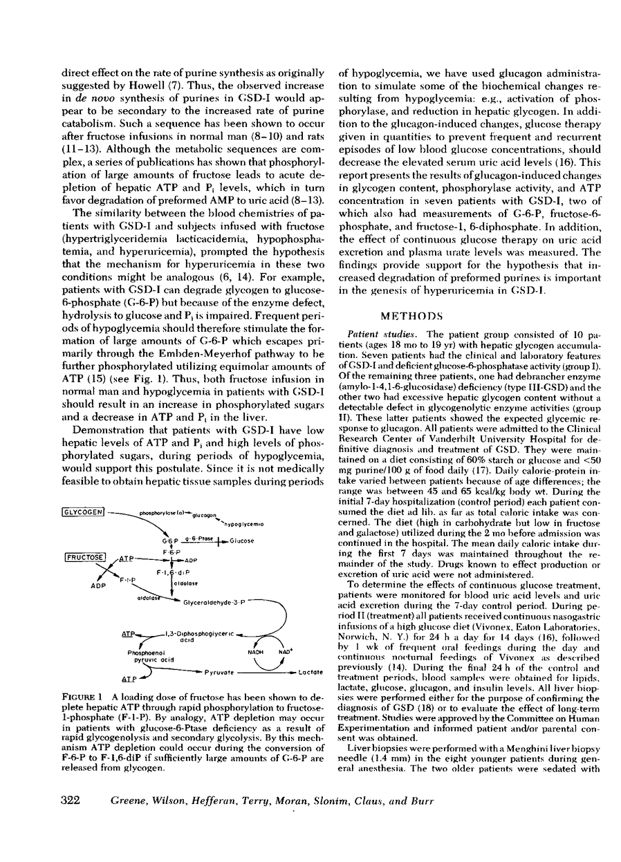 Other investigators have shown that fructose infusion in normal man and rats acutely depletes hepatic ATP and Pi and increases the rate of uric acid formation by the degradation of preformed nucleotides. We postulated that a similar mechanism of ATP depletion might be present in patients with glucose-6-phosphatase deficiency (GSD-I) as a result of ATP consumption during glycogenolysis and resulting excess glycolysis. The postulate was tested by measurement of: (a) hepatic content of ATP, glycogen, phosphorylated sugars, and phosphorylase activities before and after increasing glycolysis by glucagon infusion and (b) plasma urate levels and urate excretion before and after therapy designed to maintain blood glucose levels above 70 mg/dl and thus prevent excess glycogenolysis and glycolysis.