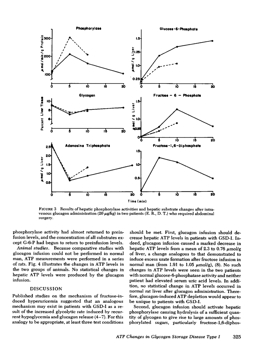 Other investigators have shown that fructose infusion in normal man and rats acutely depletes hepatic ATP and Pi and increases the rate of uric acid formation by the degradation of preformed nucleotides. We postulated that a similar mechanism of ATP depletion might be present in patients with glucose-6-phosphatase deficiency (GSD-I) as a result of ATP consumption during glycogenolysis and resulting excess glycolysis. The postulate was tested by measurement of: (a) hepatic content of ATP, glycogen, phosphorylated sugars, and phosphorylase activities before and after increasing glycolysis by glucagon infusion and (b) plasma urate levels and urate excretion before and after therapy designed to maintain blood glucose levels above 70 mg/dl and thus prevent excess glycogenolysis and glycolysis.