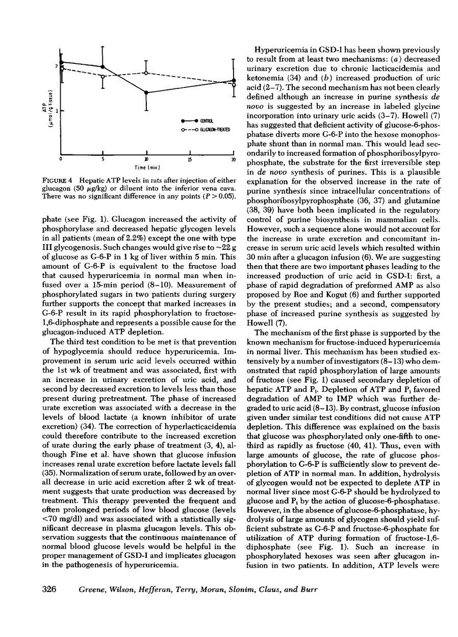 Other investigators have shown that fructose infusion in normal man and rats acutely depletes hepatic ATP and Pi and increases the rate of uric acid formation by the degradation of preformed nucleotides. We postulated that a similar mechanism of ATP depletion might be present in patients with glucose-6-phosphatase deficiency (GSD-I) as a result of ATP consumption during glycogenolysis and resulting excess glycolysis. The postulate was tested by measurement of: (a) hepatic content of ATP, glycogen, phosphorylated sugars, and phosphorylase activities before and after increasing glycolysis by glucagon infusion and (b) plasma urate levels and urate excretion before and after therapy designed to maintain blood glucose levels above 70 mg/dl and thus prevent excess glycogenolysis and glycolysis.