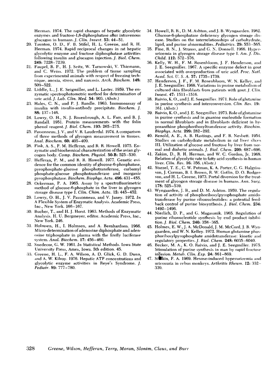 Other investigators have shown that fructose infusion in normal man and rats acutely depletes hepatic ATP and Pi and increases the rate of uric acid formation by the degradation of preformed nucleotides. We postulated that a similar mechanism of ATP depletion might be present in patients with glucose-6-phosphatase deficiency (GSD-I) as a result of ATP consumption during glycogenolysis and resulting excess glycolysis. The postulate was tested by measurement of: (a) hepatic content of ATP, glycogen, phosphorylated sugars, and phosphorylase activities before and after increasing glycolysis by glucagon infusion and (b) plasma urate levels and urate excretion before and after therapy designed to maintain blood glucose levels above 70 mg/dl and thus prevent excess glycogenolysis and glycolysis.