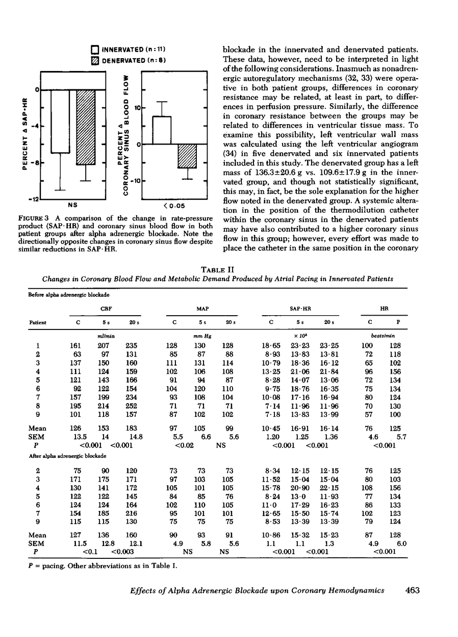 The effect of alpha adrenergic block-ade on coronary blood flow regulation at rest was studied in 11 normally innervated patients and 8 cardiac allograft recipients by measuring arterial pressure and coronary sinus blood flow by thermodilution before and after alpha adrenergic blockade with phentolamine. Coronary vascular resistance was calculated by using coronary sinus blood flow and mean arterial pressure, and metabolic demand was estimated by the product of systolic arterial pressure and heart rate. In addition, the coronary sinus blood flow response to tachycardia was examined in 9 innervated patients and 12 denervated patients, with measurements repeated after phentolamine in 8 of the 9 innvervated patients and 6 of the 12 denervated patients. There was a 7.3±4.4% increase in coronary sinus blood flow in the innervated patients in response to alpha blockade, whereas the transplanted patients had an 8.2±1.8% fall in coronary sinus blood flow, despite equivalent changes in rate pressure product. The innervated patients also demonstrated a significantly greater increase in coronary sinus blood flow than did the transplanted patients during the first 5 s of an abrupt increase in heart rate (26±4 vs. 8±2.5 ml/min, P <0.001). This early response was blunted after alpha adrenergic blockade. We conclude that there is basal alpha adrenergic tone present on the coronary vasculature in man that is withdrawn by a sudden increase in heart rate.