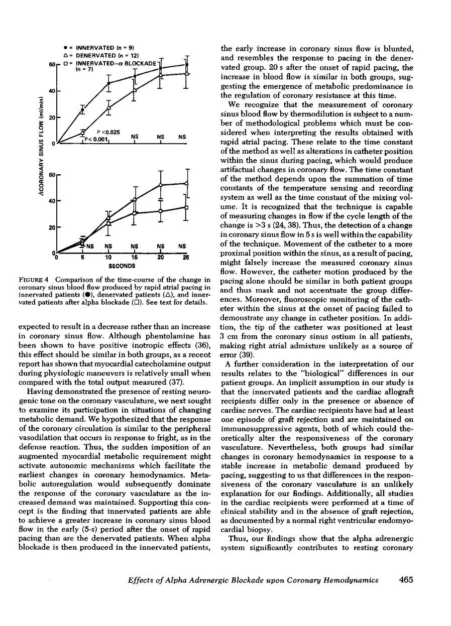 The effect of alpha adrenergic block-ade on coronary blood flow regulation at rest was studied in 11 normally innervated patients and 8 cardiac allograft recipients by measuring arterial pressure and coronary sinus blood flow by thermodilution before and after alpha adrenergic blockade with phentolamine. Coronary vascular resistance was calculated by using coronary sinus blood flow and mean arterial pressure, and metabolic demand was estimated by the product of systolic arterial pressure and heart rate. In addition, the coronary sinus blood flow response to tachycardia was examined in 9 innervated patients and 12 denervated patients, with measurements repeated after phentolamine in 8 of the 9 innvervated patients and 6 of the 12 denervated patients. There was a 7.3±4.4% increase in coronary sinus blood flow in the innervated patients in response to alpha blockade, whereas the transplanted patients had an 8.2±1.8% fall in coronary sinus blood flow, despite equivalent changes in rate pressure product. The innervated patients also demonstrated a significantly greater increase in coronary sinus blood flow than did the transplanted patients during the first 5 s of an abrupt increase in heart rate (26±4 vs. 8±2.5 ml/min, P <0.001). This early response was blunted after alpha adrenergic blockade. We conclude that there is basal alpha adrenergic tone present on the coronary vasculature in man that is withdrawn by a sudden increase in heart rate.