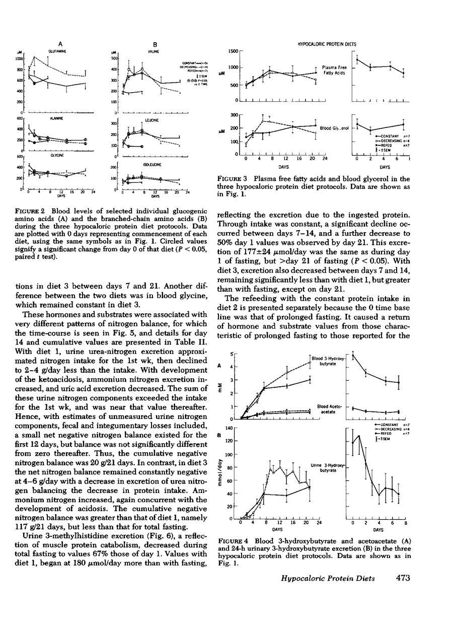 Exogenous protein in the absence of other calories can cause protein-sparing, but the mechanisms involved are controversial. It has been postulated that low insulin and high fat-derived substrate levels are necessary and sufficient conditions for such protein-sparing. We therefore established such conditions with differing protocols of protein input to define the role of protein input in mediating the response. Three groups of obese, nondiabetic subjects received the following diets: (1) 82.5±1.0 g protein/day (400 cal/day) for 21 days, n = 7; (2) the same, but as a refeeding diet for 7 days after 21-28 days of total fasts, n = 7; and (3) commencing with the same input, but with daily stepwise decrements over 14 days to 19.4±2.2 g/day, then maintained an additional 7 days, n = 4. Diet 3 gave approximately the amount and pattern of protein lost during total fasting.