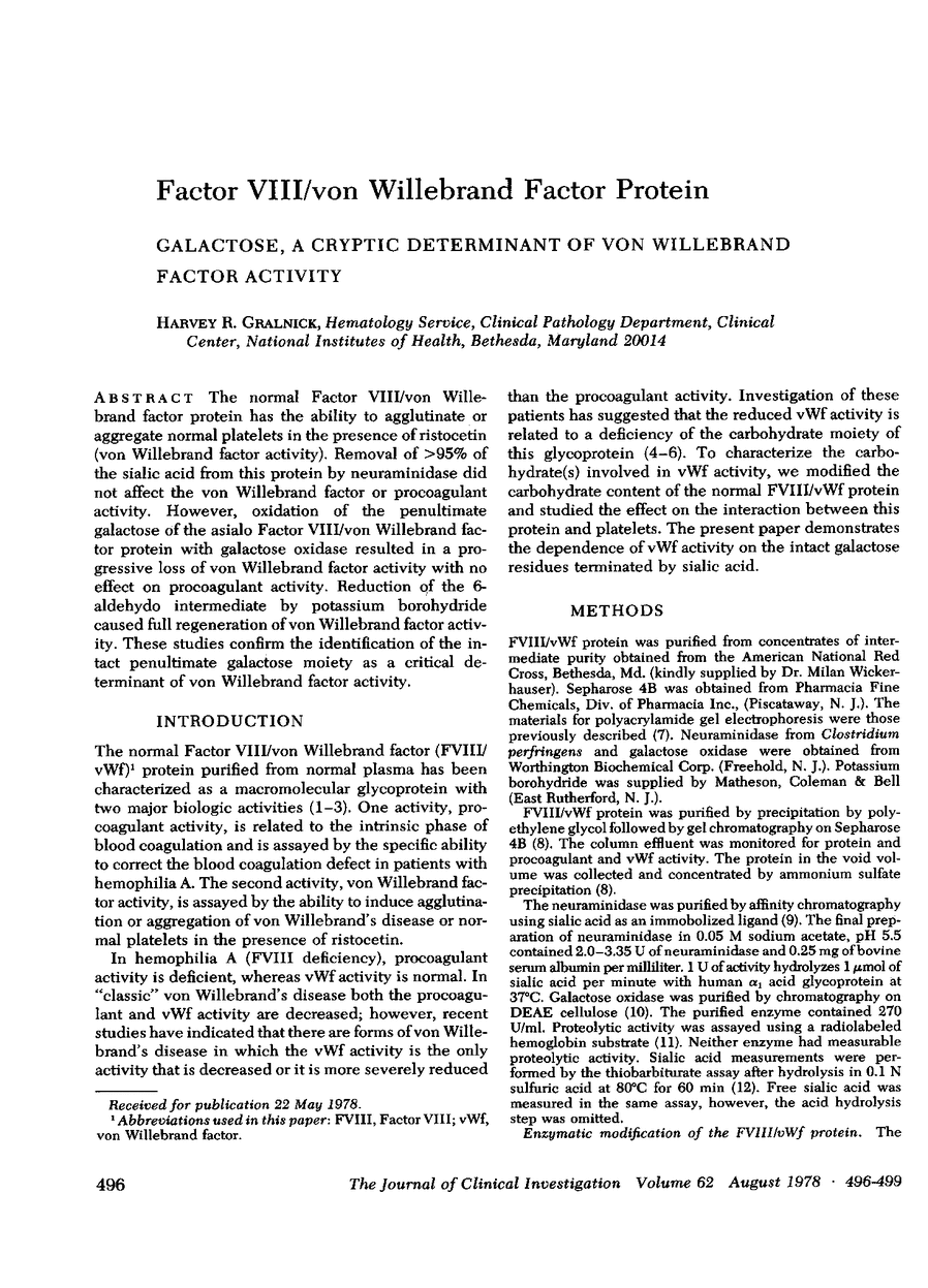 The normal Factor VIII/von Willebrand factor protein has the ability to agglutinate or aggregate normal platelets in the presence of ristocetin (von Willebrand factor activity). Removal of greater than 95% of the sialic acid from this protein by neuraminidase did not affect the von Willebrand factor or procoagulant activity. However, oxidation of the penultimate galactose of the asialo Factor VIII/von Willebrand factor protein with galactose oxidase resulted in a progressive loss of von Willebrand factor activity with no effect on procoagulant activity. Reduction of the 6-aldehydo intermediate by potassium borohydride caused full regeneration of von Willebrand factor activity. These studies confirm the identification of the intact penultimate galactose moiety as a critical determinant of von Willebrand factor activity.