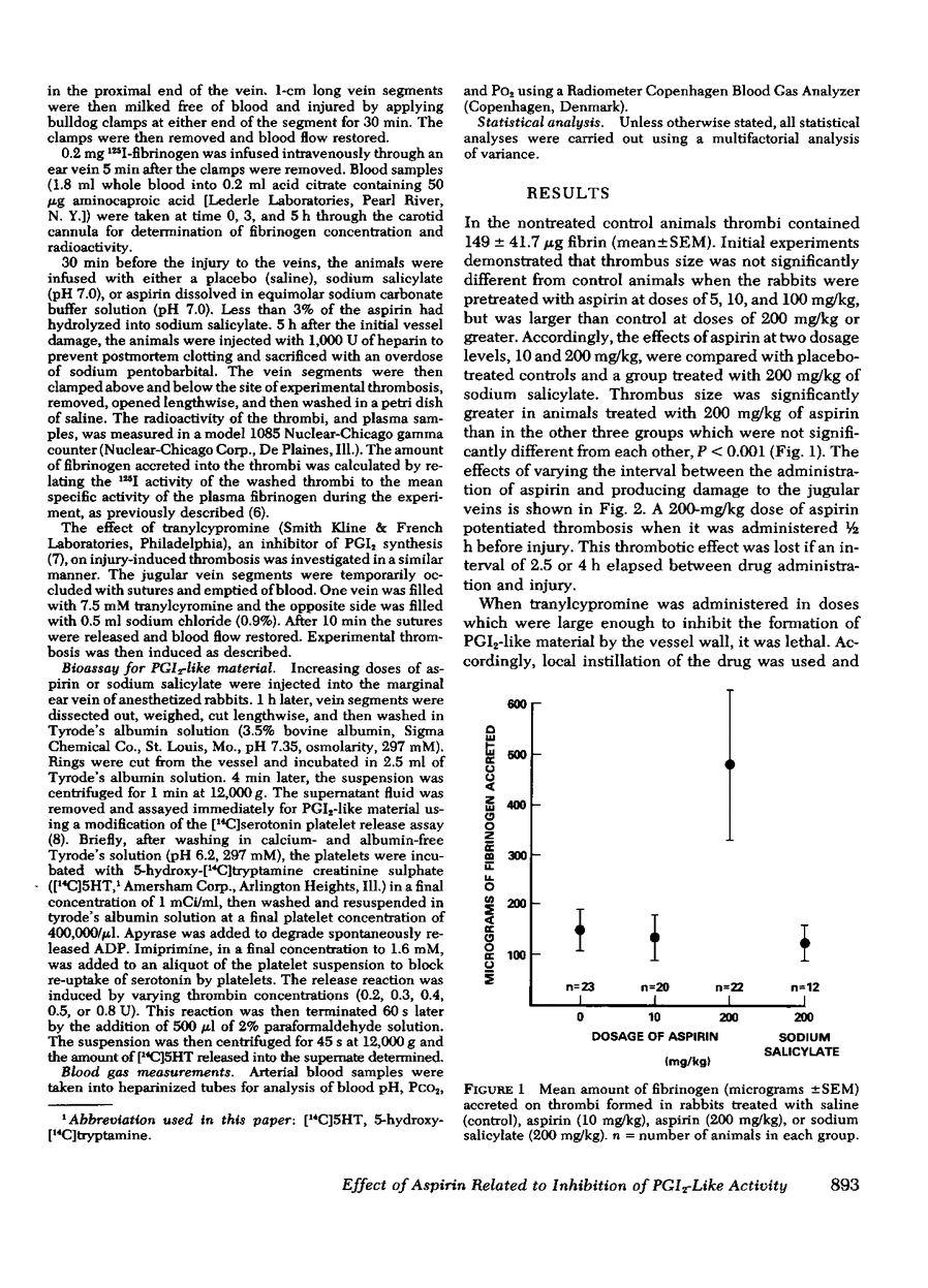 Aspirin is a promising antithrombogenic agent. It inhibits the generation of thromboxane A2 by acetylating platelet cyclo-oxygenase. Aspirin also inhibits vessel wall production of PGI2 which is an inhibitor of platelet aggregation, and therefore is potentially thrombotic. To investigate these two opposing effects we studied the effects of aspirin upon fibrin accretion onto experimentally induced venous thrombi in rabbits and on the PGI2-like activity of vessel wall using the thrombin-induced [14C]serotonin release assay. A 200-mg/kg dose of aspirin significantly augmented thrombus size when compared to (a) sodium salicylate administered in equal doses, (b) aspirin in a 10-mg/kg dose or (c) controls (P < 0.001). A 200-mg/kg dose of aspirin totally inhibited vessel wall PGI2-like activity whereas aspirin in a 10-mg/kg dose produced less inhibition, and 200 mg/kg sodium salicylate had no effect. Local instillation of tranylcypromine, an inhibitor of PGI2 formation, also significantly augmented thrombus size compared to saline-treated controls and totally inhibited the production of PGI2-like activity. The thrombogenic effect of high dose aspirin was lost if an interval of 2.5 h or longer elapsed between vessel damage and drug administration, indicating that in contrast to the platelet, the effect of aspirin on vessel wall prostaglandin synthesis is relatively short-lived. It is concluded that aspirin, in doses higher than those used clinically, can augment experimental thrombosis, presumably by inhibiting the synthesis of vessel wall PGI2.