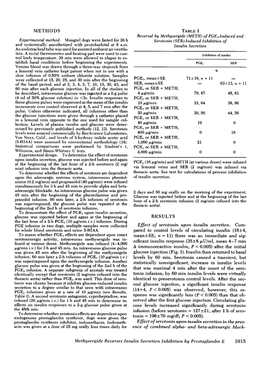 These studies were designed to examine whether interrelationships exist between serotonin and prostaglandin E (PGE) during regulation of insulin secretion in dogs in vivo. In our studies serotonin was found to inhibit insulin responses to intravenous glucose. This inhibition was not reversed by complete adrenergic blockade provided through combined phentolamine and propranolol pretreatment. This property of serotonin is similar to that of PGE which also inhibits glucose-induced insulin secretion in vivo independently of adrenergic activity. To investigate whether these effects of serotonin and PGE are related, studies with methysergide (a serotonin antagonist) and indomethacin (a PGE synthesis inhibitor) were performed. Methysergide reversed the effects of both PGE and serotonin. In contrast, indomethacin did not diminish the inhibitory effect of serotonin upon insulin secretion. It is hypothesized that endogenous serotonin may play a role in the inhibitory effect of PGE upon insulin secretion in dogs in vivo.