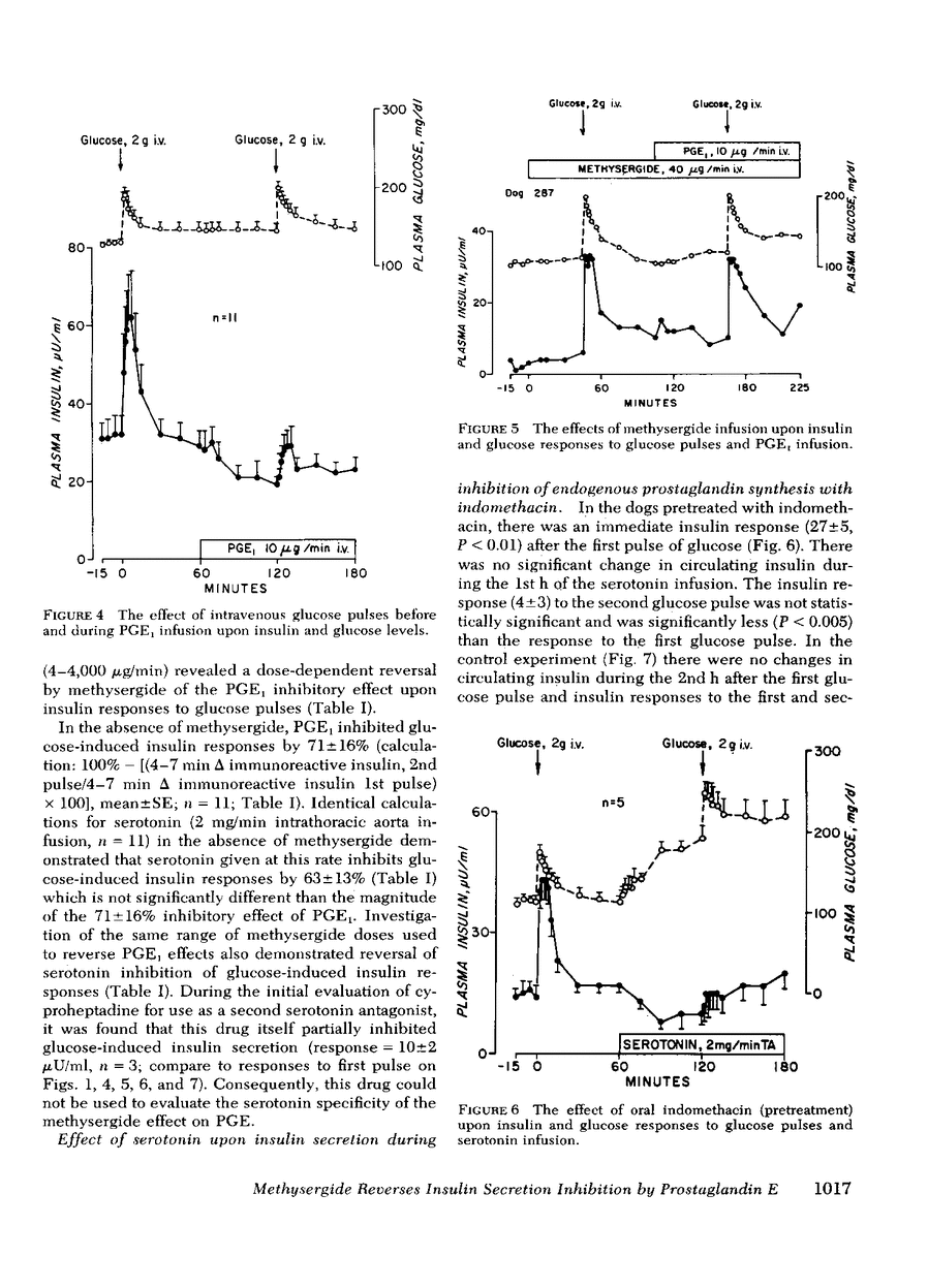 These studies were designed to examine whether interrelationships exist between serotonin and prostaglandin E (PGE) during regulation of insulin secretion in dogs in vivo. In our studies serotonin was found to inhibit insulin responses to intravenous glucose. This inhibition was not reversed by complete adrenergic blockade provided through combined phentolamine and propranolol pretreatment. This property of serotonin is similar to that of PGE which also inhibits glucose-induced insulin secretion in vivo independently of adrenergic activity. To investigate whether these effects of serotonin and PGE are related, studies with methysergide (a serotonin antagonist) and indomethacin (a PGE synthesis inhibitor) were performed. Methysergide reversed the effects of both PGE and serotonin. In contrast, indomethacin did not diminish the inhibitory effect of serotonin upon insulin secretion. It is hypothesized that endogenous serotonin may play a role in the inhibitory effect of PGE upon insulin secretion in dogs in vivo.