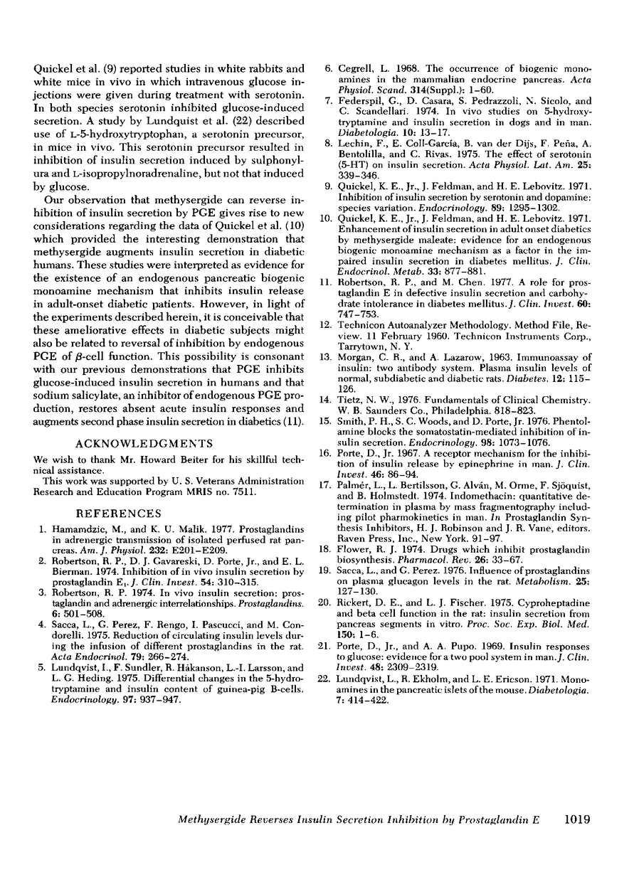 These studies were designed to examine whether interrelationships exist between serotonin and prostaglandin E (PGE) during regulation of insulin secretion in dogs in vivo. In our studies serotonin was found to inhibit insulin responses to intravenous glucose. This inhibition was not reversed by complete adrenergic blockade provided through combined phentolamine and propranolol pretreatment. This property of serotonin is similar to that of PGE which also inhibits glucose-induced insulin secretion in vivo independently of adrenergic activity. To investigate whether these effects of serotonin and PGE are related, studies with methysergide (a serotonin antagonist) and indomethacin (a PGE synthesis inhibitor) were performed. Methysergide reversed the effects of both PGE and serotonin. In contrast, indomethacin did not diminish the inhibitory effect of serotonin upon insulin secretion. It is hypothesized that endogenous serotonin may play a role in the inhibitory effect of PGE upon insulin secretion in dogs in vivo.