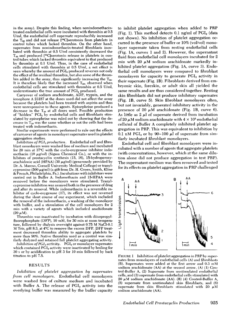 Prostacyclin (PGI2) is an unstable prostaglandin which inhibits platelet aggregation and serotonin release and causes vasodilation. The PGI2 activity produced by monolayers of cultured human endothelial cells and fibroblasts was measured by the ability of their supernates to inhibit platelet aggregation in platelet-rich plasma, or to inhibit thrombin-induced [14C]serotonin release from aspirin-treated, washed platelet suspensions. Monolayers of cultured human endothelial cells, stimulated with sodium arachidonate, thrombin, the ionophore A 23187, or trypsin, secreted PGI2 into the supernatant medium. Monolayers of fibroblasts produced PGI2 activity only when stimulated by arachidonate. “Resting,” intact monolayers did not produce detectable PGI2, nor did monolayers treated with ADP or epinephrine. Production of PGI2 activity was abolished by treatment of the monolayers with indomethacin, tranylcypromine, or 15-hydroperoxy arachidonic acid. The PGI2 activity of the supernates was destroyed by boiling or acidification. Inhibition of thrombin with diisopropylfluoro-phosphate, and of trypsin with soybean trypsin inhibitor, abolished the stimulation of PGI2 production by these enzymes. Production of thrombin at a site of vascular injury could, by stimulating PGI2 synthesis by endothelial cells adjacent to the injured area, limit the number of platelets involved in the primary hemostatic response and help to localize thrombus formation.