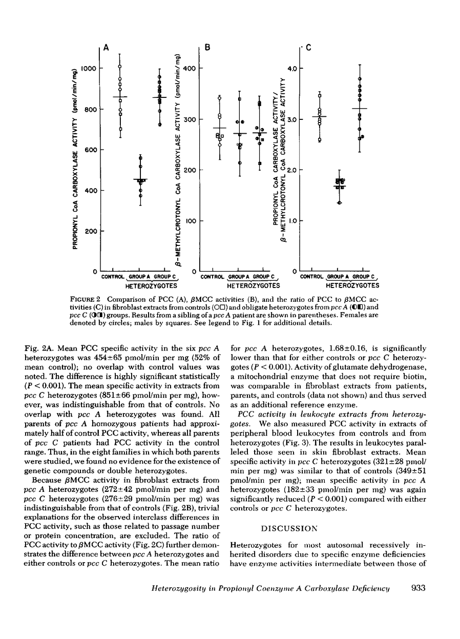 We measured propionyl coenzyme A carboxylase (PCC) activity in extracts of skin fibroblasts and peripheral blood leukocytes from controls and obligate heterozygotes for PCC deficiency. 6 heterozygotes were from the pcc A complementation group; 12 were from the other major complementation group, designated pcc C. Mean PCC activity in fibroblast extracts from pcc A heterozygotes was 52% of that in controls, whereas mean PCC activity in pcc C heterozygotes was indistinguishable from that of controls. Similar results were obtained with extracts of peripheral blood leukocytes. In none of eight families (three pcc A and five pcc C) in which PCC activity was studied in both parents of an affected child were significant intrafamilial differences observed. The activities of two other mitochondrial enzymes (β-methyl-crotonyl CoA carboxylase and glutamate dehydrogenase) were comparable in controls and both groups of heterozygotes. Whereas the data from pcc A heterozygotes are consistent with expected gene dosage effects, those from pcc C heterozygotes are not. Inasmuch as mammalian PCC is a large molecular weight tetramer, each protomer of which is probably composed of two nonidentical subunits, the latter results are most consistent with unbalanced rates of synthesis and(or) degradation of the two subunits in normal cells with compensatory balancing in pcc C heterozygotes.