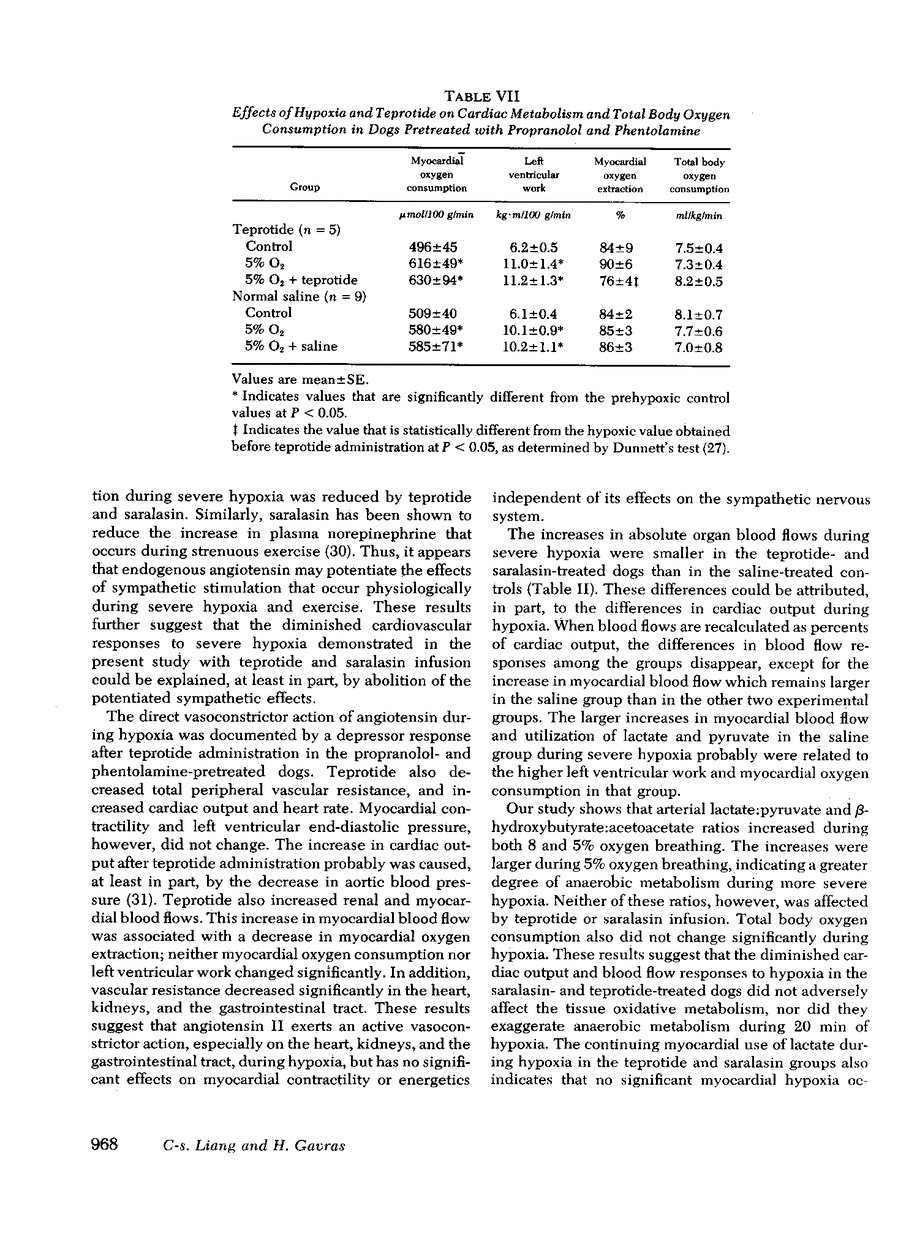 The role of the renin-angiotensin system in mediating the circulatory and metabolic responses to hypoxia was studied in three groups of conscious dogs that were infused continuously with normal saline, teprotide (10 μg/kg per min), and saralasin (1 μg/kg per min), respectively. Hypoxia was produced by switching from breathing room air to 5 or 8% oxygen-nitrogen mixture. Plasma renin activity increased from 2.3±0.4 to 4.9±0.8 ng/ml per h during 8% oxygen breathing, and from 2.8±0.4 to 8.4±1.8 ng/ml per h during 5% oxygen breathing. As expected, cardiac output, heart rate, mean aortic blood pressure, and left ventricular dP/dt and dP/dt/P increased during both 5 and 8% oxygen breathing in the saline-treated dogs; greater increases occurred during the more severe hypoxia. Teprotide and saralasin infusion diminished the hemodynamic responses to 5% oxygen breathing, but did not affect the responses to 8% oxygen breathing significantly. In addition, the increased blood flows to the myocardium, kidneys, adrenals, brain, intercostal muscle, and diaphragm that usually occur during 5% oxygen breathing were reduced by both agents. These agents also reduced the increases in plasma norepinephrine concentration during 5% oxygen breathing, but had no effects on tissue aerobic or anaerobic metabolism.