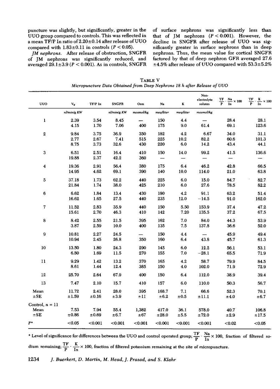 The effects of acute unilateral ureteral obstruction (UUO) of 18 h duration on deep nephron function was evaluated in 14 weanling rats with the technique of micropuncture. After release of UUO, 3.4 +/- 0.66% (SE) of the filtered water remained at the tip of the collecting duct nearly fivefold greater than in controls (0.75 +/- 0.10%). Similar differences were seen in fractional sodium that remained at this site. The ratio of tubular fluid osmolality to that of plasma was also reduced in the UUO group (1.53 +/- 0.06 vs. 4.60 +/- 0.26 in controls, P less than 0.001). Single nephron glomerular filtration rate of cortical and deep nephrons was significantly less (P less than 0.001) after release of UUO. Although the percentage of filtering nephrons was significantly reduced in both nephron populations, the decline in glomerular filtration rate was greater in cortical than in juxtamedullary nephrons (cortical:juxtamedullary nephrons = 27.6 +/- 4.5% vs. 53.3 +/- 5.2% in controls, P less than 0.005) which suggests that single nephron glomerular filtration rate is redistributed to deep nephrons after release of UUO. In contrast to cortical nephrons, the amount of tubular fluid which remains near the bend of the loop of Henle of deep nephrons was greater after release of UUO. This appeared to be the result of a decrease in the reabsorption of both water (tubular fluid:plasma inulin = 2.41 +/- 0.16 vs. 7.94 +/- 0.69 in controls, P less than 0.001) and sodium (52.3 +/- 4% vs. 40.7 +/- 2.9% of the filtered sodium in controls, P less than 0.02). It is suggested that this altered reabsorption occurs along both the proximal tubule and descending limb of the loop of Henle of juxtamedullary nephrons. Inner medullary plasma flow (IMPF), as measured with the [125I]albumin-accumulation technique, was significantly depressed before release of UUO, but exceeded control values 90 min postrelease. Such changes imply that the filtration fraction of deep nephrons is decreased and that physical factors in the proximal tubular reabsorption of sodium have been altered. When papillary solute content was measured before release of UUO it was low (428 +/- 23 vs. 1,205 +/- 106 mosmol/kg in controls, P less than 0.001) which indicates that the decline in papillary osmolality is not a consequence of the increased IMPF seen after ureteral release, but rather precedes it. In fact, the decline in papillary osmolality may contribute to the increase in IMPF after release of UUO and to the decreased reabsorption of fluid along the descending limb of the loop of Henle.