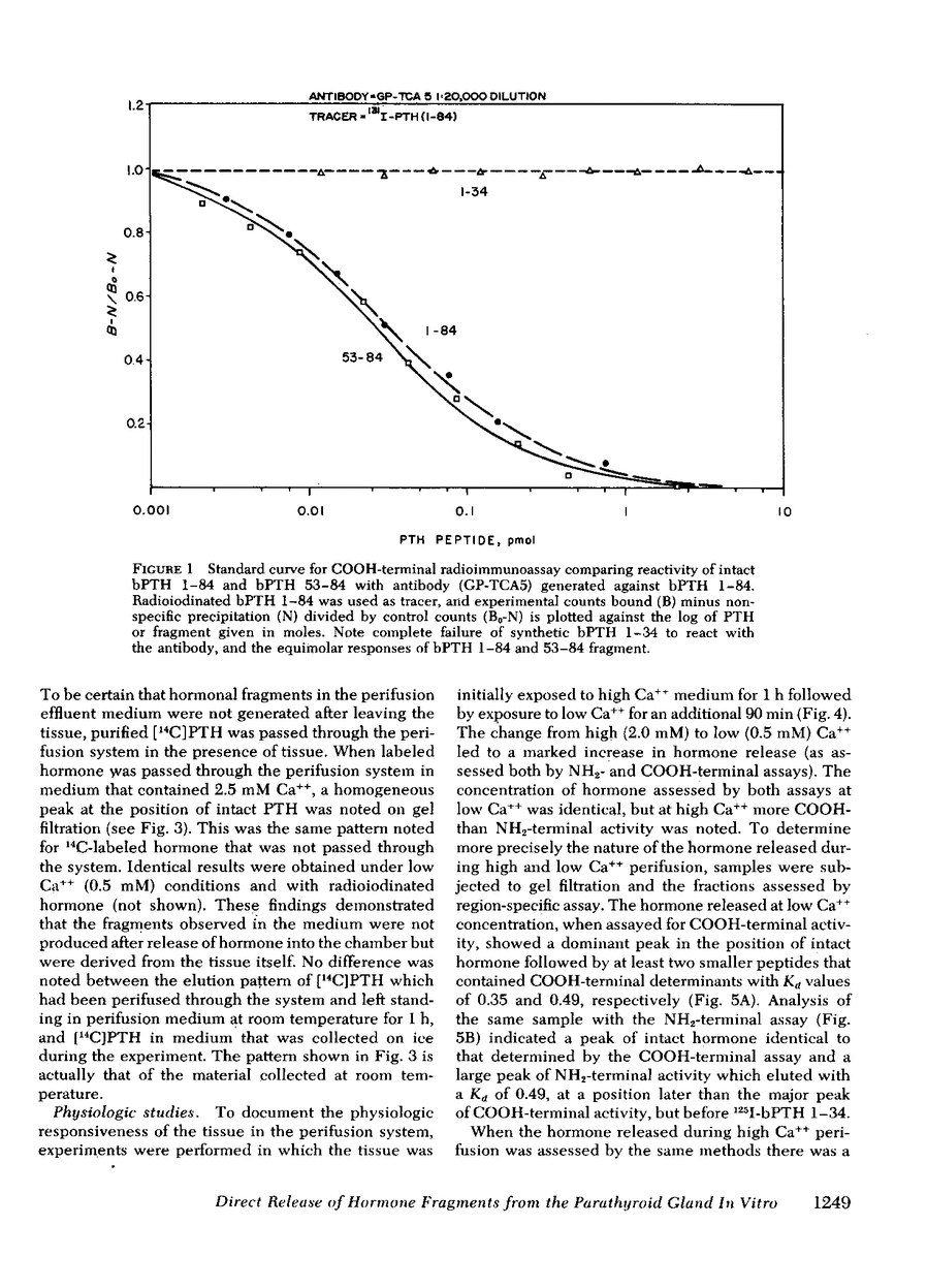To determine the origin of circulating parathyroid hormone fragments, hormonal peptides released from bovine parathyroid tissue in a physiologically responsive in vitro "perifusion" system were analyzed by gel exclusion chromatography and region-specific radioimmunoassays. When exposed to low Ca++, the tissue released large quantities of intact hormone (parathyroid hormone 1--84) as well as amino- and carboxyl-terminal fragments. Fragments of the hormone were also released when the tissue was exposed to high Ca++, but the carboxyl fragments comprised a much greater proportion of the hormonal peptides released. Control experiments indicated that fragmentation of the hormone occurred within the gland and not after it was secreted. These experiments provide direct evidence, therefore, that release of fragments from the parathyroid gland may contribute to the immunologic heterogeneity of the hormone in the circulation.
