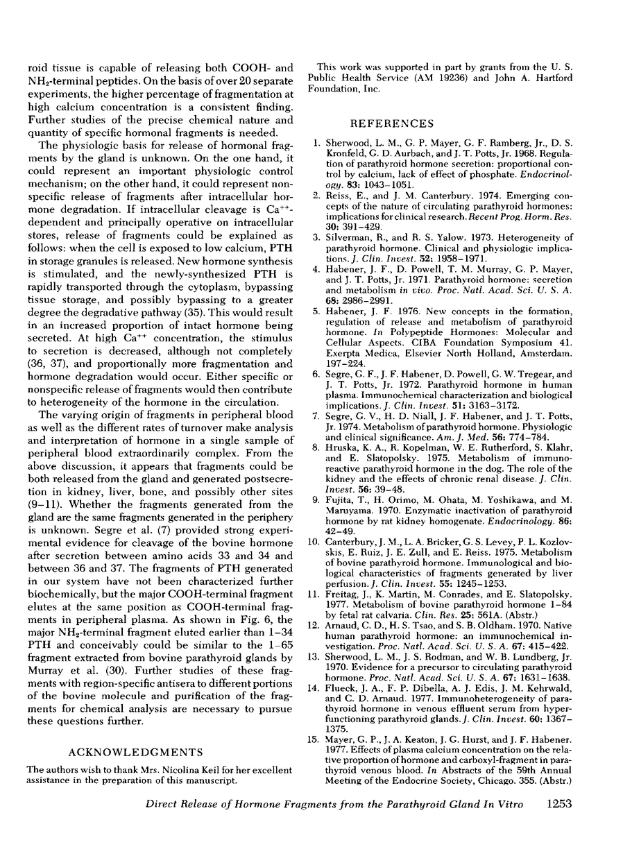To determine the origin of circulating parathyroid hormone fragments, hormonal peptides released from bovine parathyroid tissue in a physiologically responsive in vitro "perifusion" system were analyzed by gel exclusion chromatography and region-specific radioimmunoassays. When exposed to low Ca++, the tissue released large quantities of intact hormone (parathyroid hormone 1--84) as well as amino- and carboxyl-terminal fragments. Fragments of the hormone were also released when the tissue was exposed to high Ca++, but the carboxyl fragments comprised a much greater proportion of the hormonal peptides released. Control experiments indicated that fragmentation of the hormone occurred within the gland and not after it was secreted. These experiments provide direct evidence, therefore, that release of fragments from the parathyroid gland may contribute to the immunologic heterogeneity of the hormone in the circulation.