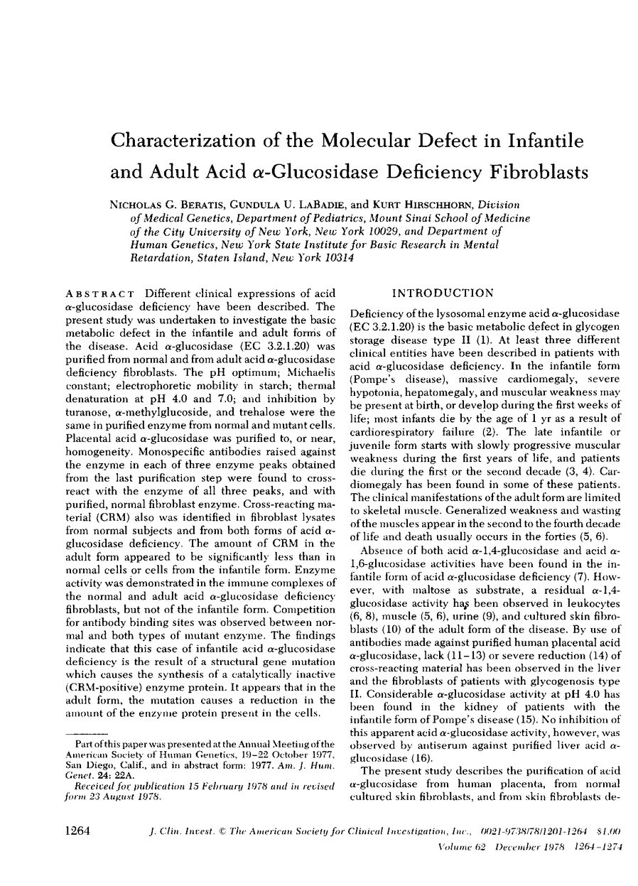Different clinical expressions of acid alpha-glucosidase deficiency have been described. The present study was undertaken to investigate the basic metabolic defect in the infantile and adult forms of the disease. Acid alpha-glucosidase (EC 3.2.1.20) was purified from normal and from adult acid alpha-glucosidase deficiency fibroblasts. The pH optimum; Michaelis constant; electrophoretic mobility in starch; thermal denaturation at pH 4.0 and 7.0; and inhibition by turanose, alpha-methylglucoside and trehalose were the same in purified enzyme from normal and mutant cells. Placental acid alpha-glucosidase was purified to, or near, homogeneity. Monospecific antibodies raised against the enzyme in each of three enzyme peaks obtained from the last purification step were found to cross-react with the enzyme of all three peaks, and with purified, normal fibroblast enzyme. Cross-reacting material (CRM) also was identified in fibroblast lysates from normal subjects and from both forms of acid alpha-glucosidase deficiency. The amount of CRM in the adult form appeared to be significantly less than in normal cells or cells from the infantile form. Enzyme activity was demonstrated in the immune complexes of the normal and adult acid alpha-glucosidase deficiency fibroblasts, but not of the infantile form. Competition for antibody binding sites was observed between normal and both types of mutant enzymes. The findings indicate that this case of infantile acid alpha-glucosidase deficiency is the result of a structural gene mutation which causes the synthesis of a catalytically inactive (CRM-positive) enzyme protein. It appears that in the adult form, the mutation causes a reduction in the amount of the enzyme protein present in the cells.
