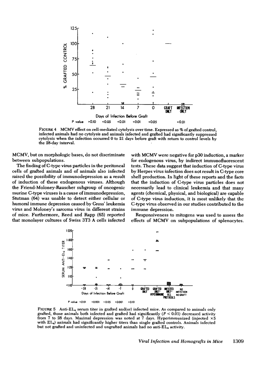 The effects on some host defenses of murine cytomegalovirus (MCMV) and(or) EL4, a mouse ascites homograft, were studied in mice. Assays of cellular and humoral immunity in response to either or both of these perturbations were carried out by quantitation of various immune activities.