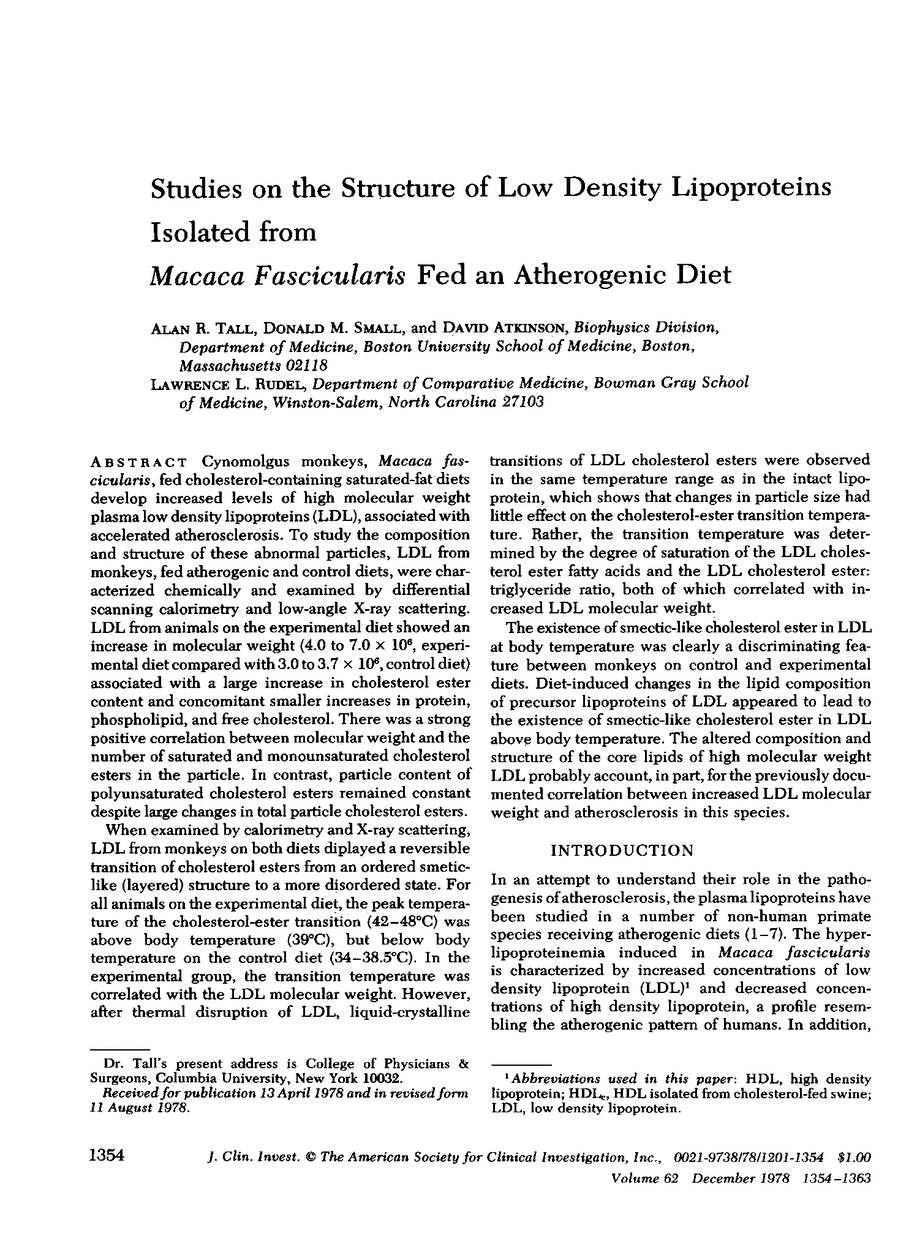 Cynomolgus monkeys, Macaca fascicularis, fed cholesterol-containing saturated-fat diets develop increased levels of high molecular weight plasma low density lipoproteins (LDL), associated with accelerated atherosclerosis. To study the composition and structure of these abnormal particles, LDL from monkeys, fed atherogenic and control diets, were characterized chemically and examined by differential scanning calorimetry and low-angle X-ray scattering. LDL from animals on the experimental diet showed an increase in molecular weight (4.0 to 7.0 × 106, experimental diet compared with 3.0 to 3.7 × 106, control diet) associated with a large increase in cholesterol ester content and concomitant smaller increases in protein, phospholipid, and free cholesterol. There was a strong positive correlation between molecular weight and the number of saturated and monounsaturated cholesterol esters in the particle. In contrast, particle content of polyunsaturated cholesterol esters remained constant despite large changes in total particle cholesterol esters.