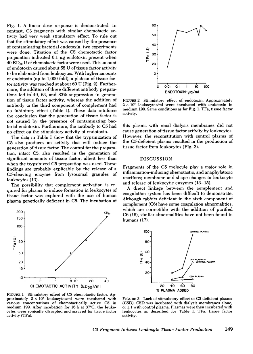 Complement-activated human plasma causes generation of tissue factor in human leukocytes. This phenomenon appears to be related to the fifth component of complement (C5) as demonstrated by the use of C5 deficient-plasma and suppression of activity with antibody to C5. Isolation of the chemotactic factor from activated serum or trypsinization of purified C5 reproduces the phenomenon. These data provide evidence for a direct link between complement products and activation of the coagulation system. Because chemotactic peptides from C5 can be generated by a variety of enzymes, our findings suggest a relationship between complement, coagulation, and inflammation.