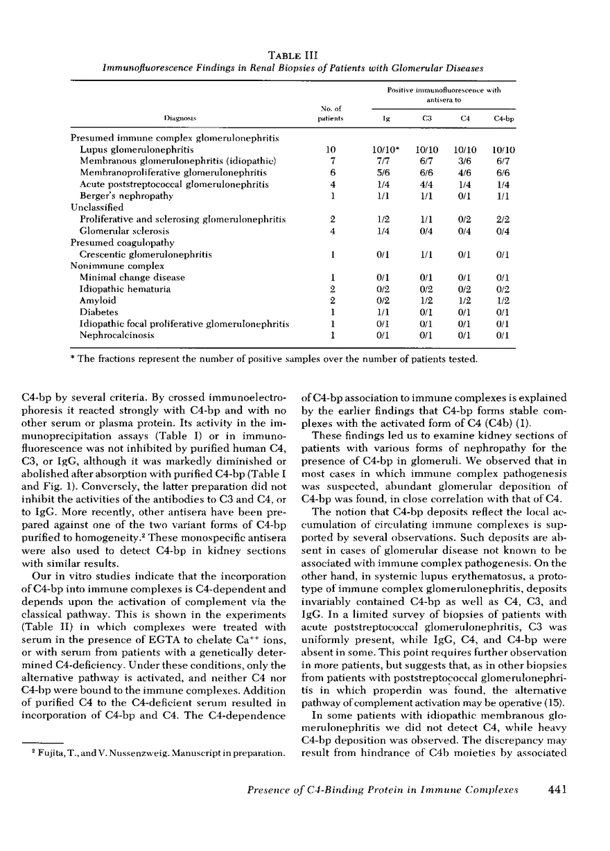 C4-binding protein (bp), a glycoprotein with specific binding affinity for the activated form of C4 (C4b), has recently been isolated from human serum and partially characterized. This report demonstrates that C4-bp is incorporated into soluble immune complexes after complement activation in vitro. The reaction requires Ca++ ions and the presence of C4 in serum. Immunopathological studies of various forms of glomerulonephritis revealed intense C4-bp deposition in glomeruli from patients with immune-complex type of pathogenesis. C4-bp deposition was in close correlation with that of C4. These observations, together with the in vitro association of C4-bp to immune complexes, support the notion that the deposits in glomeruli represent the local accumulation of immune complexes.
