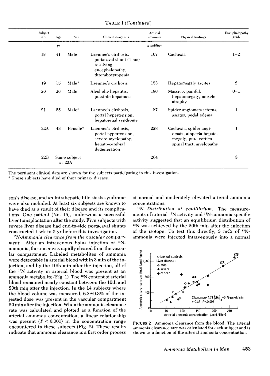 The cyclotron-produced radionuclide, 13N, was used to label ammonia and to study its metabolism in a group of 5 normal subjects and 17 patients with liver disease, including 5 with portacaval shunts and 11 with encephalopathy. Arterial ammonia levels were 52-264 micron. The rate of ammonia clearance from the vascular compartment (metabolism) was a linear function of its arterial concentration: mumol/min = 4.71 [NH3]a + 3.76, r = +0.85, P less than 0.005. Quantitative body scans showed that 7.4 +/- 0.3% of the isotope was metabolized by the brain. The brain ammonia utilization rate, calculated from brain and blood activities, was a function of the arterial ammonia concentration: mumol/min per whole brain = 0.375 [NH3]a - 3.6, r = +0.93, P less than 0.005. Assuming that cerebral blood flow and brain weights were normal, 47 +/- 3% of the ammonia was extracted from arterial blood during a single pass through the normal brains. Ammonia uptake was greatest in gray matter. The ammonia utilization reaction(s) appears to take place in a compartment, perhaps in astrocytes, that includes less than 20% of all brain ammonia. In the 11 nonencephalopathic subjects the [NH3]a was 100 +/- 8 micron and the brain ammonia utilization rate was 32 +/- 3 mumol/min per whole brain; in the 11 encephalopathic subjects these were respectively elevated to 149 +/- 18 micron (P less than 0.01), and 53 +/- 7 mumol/min per whole brain (P less than 0.01). In normal subjects, approximately equal to 50% of the arterial ammonia was metabolized by skeletal muscle. In patients with portal-systemic shunting, muscle may become the most important organ for ammonia detoxification. Muscle atrophy may thereby contribute to the development of hyperammonemic encephalopathy with an associated increase in the brain ammonia utilization rate.