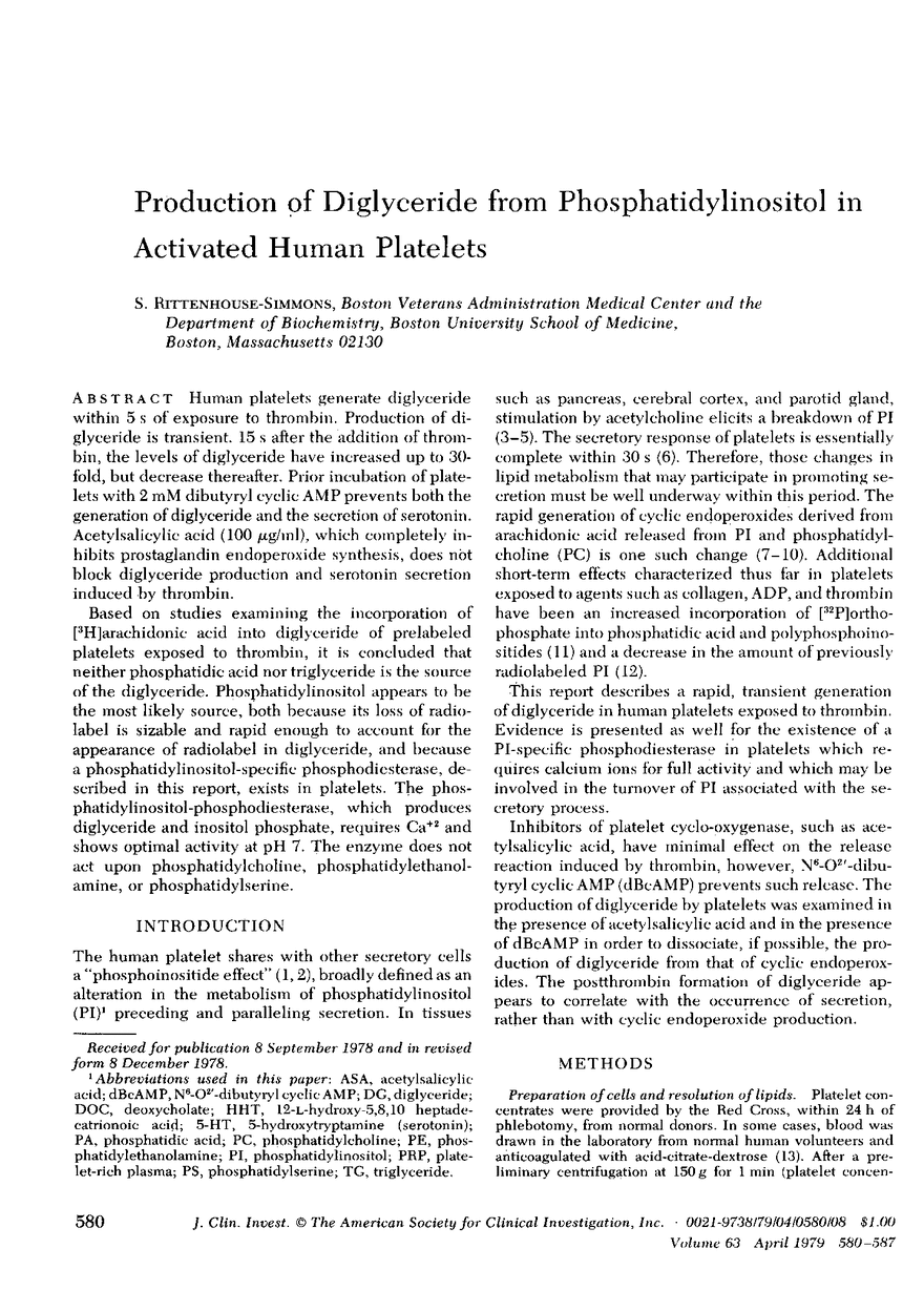 Human platelets generate diglyceride within 5 s of exposure to thrombin. Production of diglyceride is transient. 15 s after the addition of thrombin, the levels of diglyceride have increased up to 30-fold, but decrease thereafter. Prior incubation of platelets with 2 mM dibutyryl cyclic AMP prevents both the generation of diglyceride and the secretion of serotonin. Acetylsalicylic acid (100 microgram/ml), which completely inhibits prostaglandin endoperoxide synthesis, does not block diglyceride production and serotonin secretion induced by thrombin. Based on studies examining the incorporation of [3H]arachidonic acid into diglyceride of prelabeled platelets exposed to thrombin, it is concluded that neither phosphatidic acid nor triglyceride is the source of the diglyceride. Phosphatidylinositol appears to be the most likely source, both because its loss of radiolabel is sizable and rapid enough to account for the appearance of radiolabel in diglyceride, and because a phosphatidylinositol-specific phosphodiesterase, described in this report, exists in platelets. The phosphatidylinositol-phosphodiesterase, which produces diglyceride and inositol phosphate, requires Ca+2 and shows optimal activity at pH 7. The enzyme does not act upon phosphatidylcholine, phosphatidylethanolamine, or phosphatidylserine.