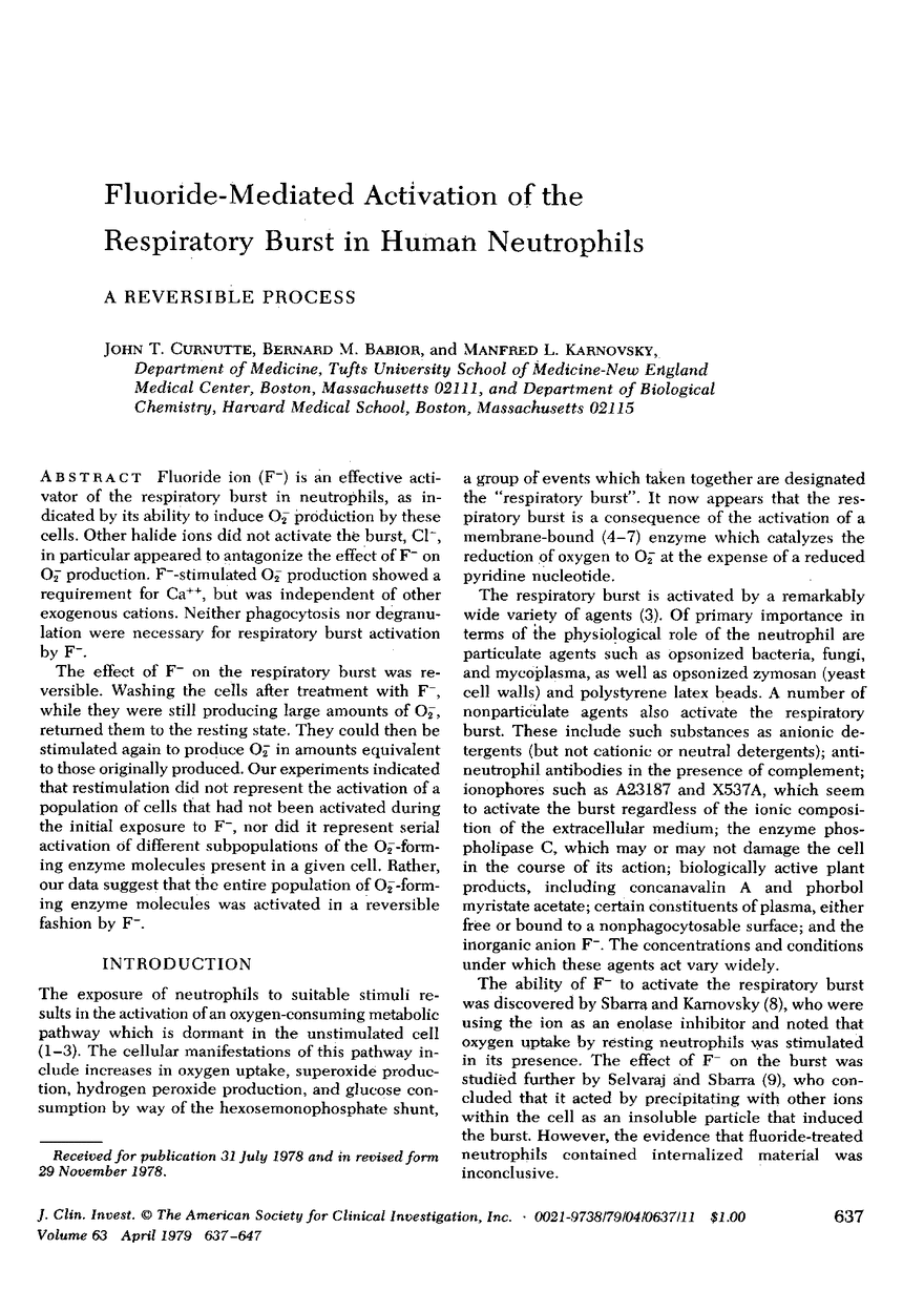Fluoride ion (F-) is an effective activator of the respiratory burst in neutrophils, as indicated by its ability to induce O2- production by these cells. Other halide ions did not activate the burst, Cl-, in particular appeared to antagonize the effect of F- on O2- production. F- stimulated O2- production showed a requirement for Ca++, but was independent of other exogenous cations. Neither phagocytosis nor degranulation were necessary for respiratory burst activation by F-. The effect of F- on the respiratory burst was reversible. Washing the cells after treatment with F-, while they were still producing large amounts of O2-, returned them to the resting state. They could then be stimulated again to produce O2- in amounts equivalent to those originally produced. Our experiments indicated that restimulation did not represent the activation of a population of cells that had not been activated during the initial exposure to F-, nor did it represent serial activation of different subpopulation of the O2- forming enzyme molecules present in a given cell. Rather, our data suggest that the entire population of O2- forming enzyme molecules was activated in a reversible fashion by F-.