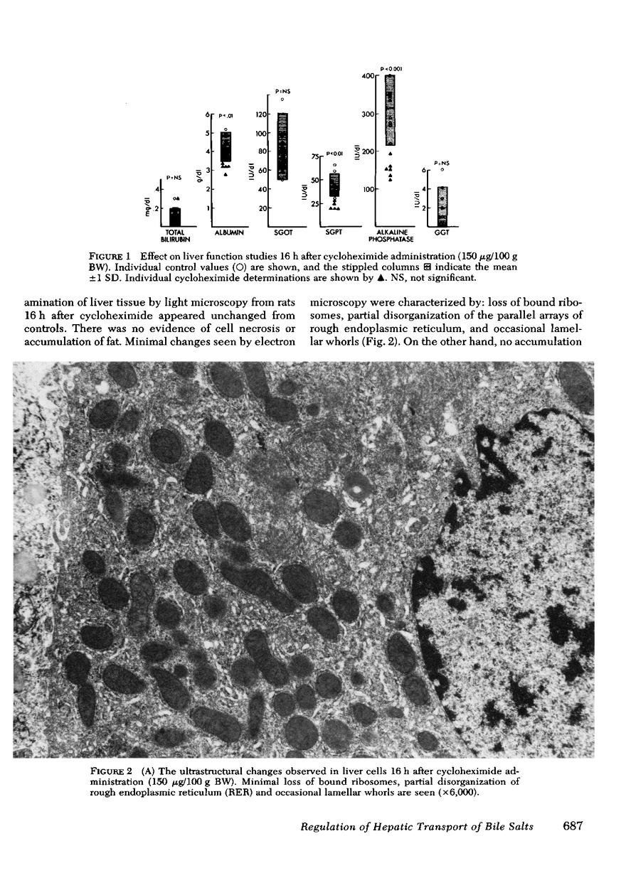 The overall transport of bile salts across the hepatocyte is characterized as a carrier-mediated process whose rate-limiting step is biliary secretion. Specific bile salt binding proteins have been identified in liver surface membrane fractions and were postulated to represent the initial interaction in bile salt translocation across both the sinusoidal and canalicular membranes. To test this hypothesis, cycloheximide was administered to rats to inhibit hepatic protein synthesis. 16 h after cycloheximide administration [14C]leucine incorporation into hepatic protein was inhibited by 93% at 1 h and 47% at 12 h. However, values of liver function tests were not increased, although serum albumin, serum alanine amino-transferase, and alkaline phosphatase were significantly decreased. Light and electron microscopy did not demonstrate necrosis or fat accumulation. The latter demonstrated minimal disorganization of rough endoplasmic reticulum and occasional lamellar whorls. 16 h after cycloheximide administration bile salt independent bile flow, basal bile salt excretion, and basal bile flow were unaltered, but the maximum bile salt transport capacity was reduced to 62% of control and 24 h later to 38%. Decreased bile salt transport was reversible, for it returned to control values after 48 h, when hepatic protein synthesis was also normal. Maximum bromosulfophthalein (BSP) transport, on the other hand, was reduced after 16 h to only 85% of control. Both bile salt and BPS maximum transport capacities decreased with time during inhibition of protein synthesis, apparently following first order kinetics. It was estimated that their half-lives are 20 h for bile salt transport and 55 h for BSP transport. These different turnover rates suggest that cycloheximide does not decrease active transport through generalized hepatic dysfunction or alteration of high energy sources possibly required for transport. The maximum number of [14C]cholic acid binding sites in liver surface membrane fractions was determined by an ultrafiltration assay. They were reduced to 68% of control after 16 h of cycloheximide and to 25% after 24 h. This reduction in the number of binding sites is apparently selective, for the activities of the liver surface membrane enzymes (Na+-K+)ATPase, Mg++-ATPase, and 5'-nucleotidase were not significantly changed. The associated alterations in bile salt transport and the maximum number of binding sites after cycloheximide administration suggests that these receptors may be the bile salt carriers.