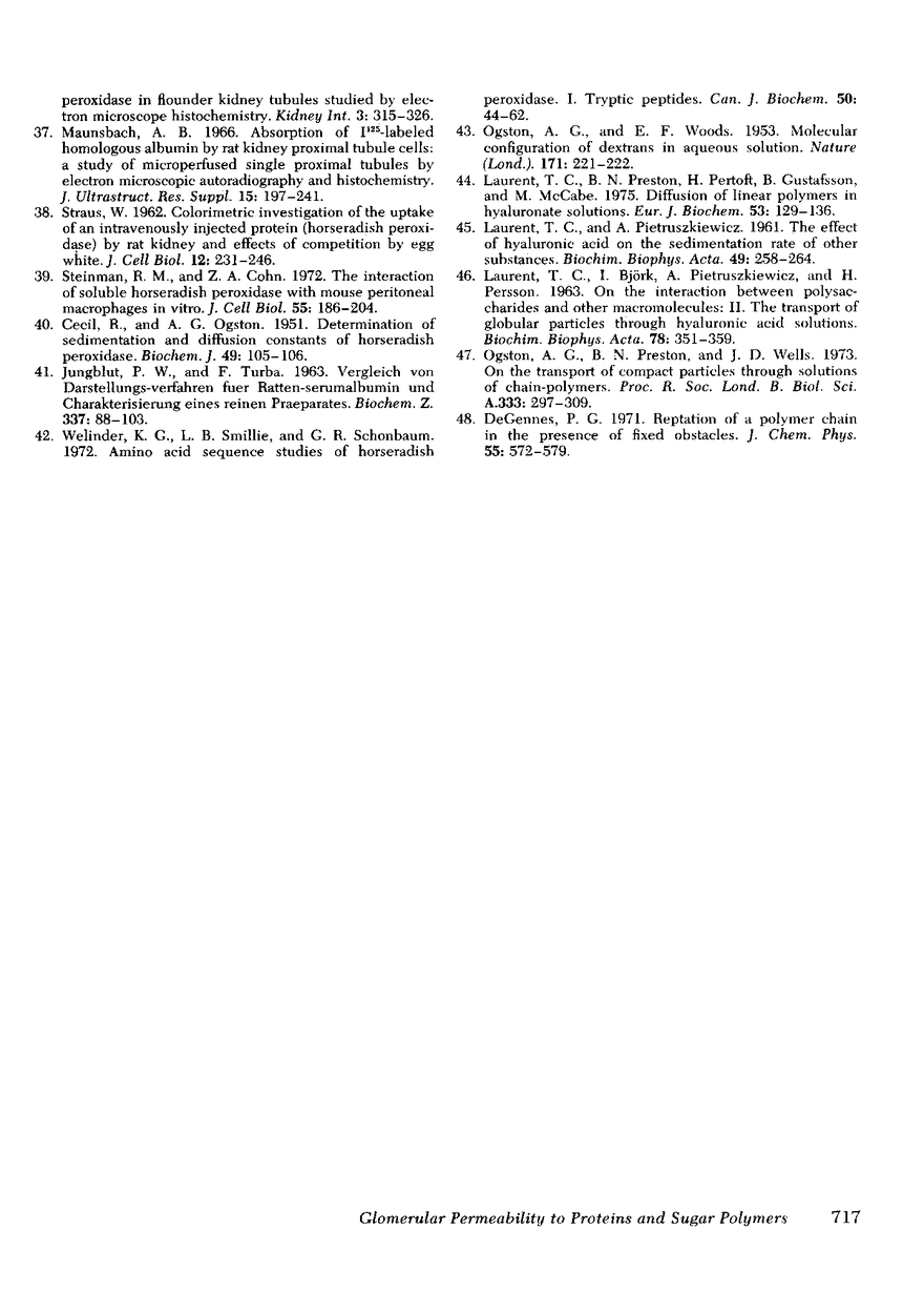 Molecular parameters other than size and charge are likely to influence the filtration of macromolecules across the glomerular filter. We have studies, therefore, the glomerular permeability of macromolecules with widely different molecular configuration such as horseradish peroxidase, a plant glycoprotein with an isoelectric point in the physiologic pH range, and dextran, an uncharged sugar polymer of D-glucopyranose. Simultaneous fractional clearances were determined for both test macromolecules in five Wistar-Furth rats. The results indicate that for a molecular radius of 28.45 A, as measured by gel filtration, the sugar polymer has a fractional clearance of 0.483 on the average, exceeding that of the protein tracer, with a value of 0.068, by a factor less than 7. We conclude that other molecular parameters such as shape, flexibility, and deformability play important roles in the transport of macromolecules across the extracellular matrix that constitutes the glomerular filter.