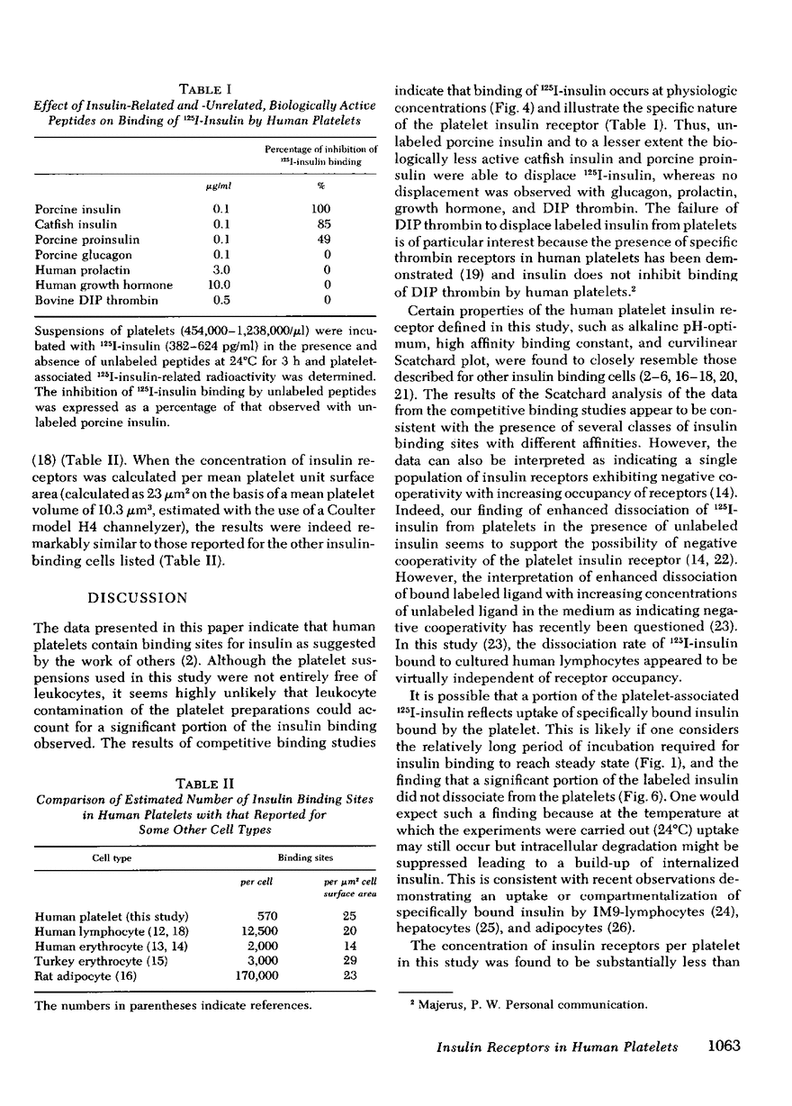 Recently, evidence has been reported to suggest that human platelets like several other circulating blood cells may bind insulin. To examine whether human platelets contain specific insulin receptors, washed human platelets suspended in Hepes buffer were incubated at 24 degrees C with 125I-insulin in the presence and absence of unlabeled insulin and specific insulin binding was determined. Insulin binding by platelets increased progressively with time of incubation to reach a maximum at 3 h and was proportional to the number of platelets in the incubation mixture. Maximum insulin binding was observed at pH 8. Insulin degradation by platelets as assessed by TCA precipitability and reincubation studies was minimal. Scatchard analysis of the binding data and dissociation studies revealed evidence of negative cooperativity of the platelet insulin receptor. A high affinity dissociation constant of approximately equal to 3 X 10(9) M-1 was determined and the concentration of platelet insulin receptors was estimated as 25 binding sites/micron2 platelet surface area. Binding of 125I-insulin by platelets was inhibited by unlabeled porcine insulin and to a lesser extent by catfish insulin and porcine proinsulin but not by glucagon, prolactin, growth hormone, and thrombin. The findings indicate that human platelets contain specific insulin receptors. The significance of the platelet insulin receptor, particularly with respect to altered platelet function in diabetes mellitus, remains to be determined.