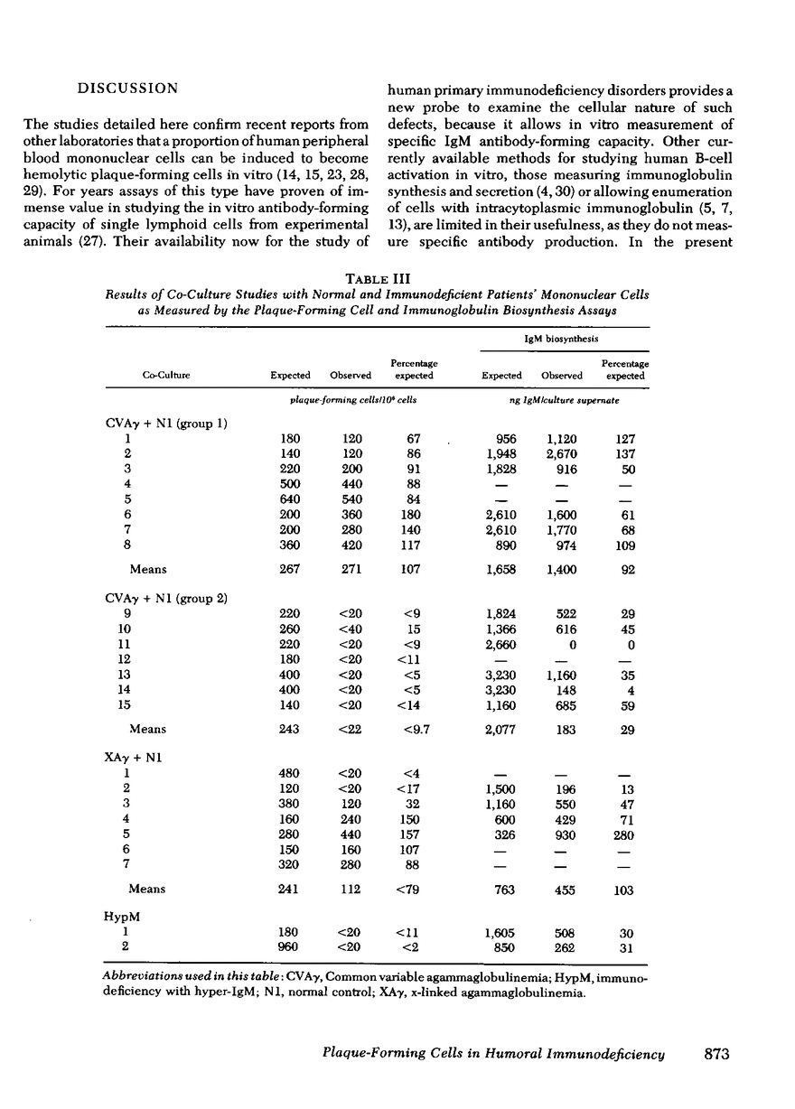 A plaque assay that detects human mononuclear blood cells producing immunoglobulin (Ig)M antibody to sheep erythrocytes was investigated for its usefulness in studying B-cell activation and regulation in 24 patients with humoral immunodeficiency. Cells from 3 of 15 patients with common variable agammaglobulinemia produced some plaques (range 40--160/10(6) cells; normal range 80--1240/10(6)), but those from the other 12, from all 7 with x-linked agammaglobulinemia and from the 2 with x-linked immunodeficiency with hyper-IgM failed to produce any detectable plaques. In co-cultures of patient and normal cells a very good correlation was seen between results of the plaque assay and an IgM biosynthesis assay in detecting excessive suppressor cell activity. Cells from 7 of 15 common variable agammaglobulinemics, from 3 of 7 x-linked agammaglobulinemics, and from both patients with hyper-IgM caused significant suppression of IgM biosynthesis and(or) plaque formation by normal cells. The observations in the last two groups and discordance for excess suppressor activity in identical twins with common variable agammaglobulinemia suggest that the activity develops secondarily to whatever their primary defects may be. Culturing non-T cells from common variable agammaglobulinemics exhibiting excessive suppressor cell activity with normal T cells resulted in plaque formation in four of five patients so studied; in all five the suppressor activity was found in the T-cell population. The availability of a plaque assay for the study of blood cells from immunodeficient patients provides a new probe to examine the cellular nature of such defects.