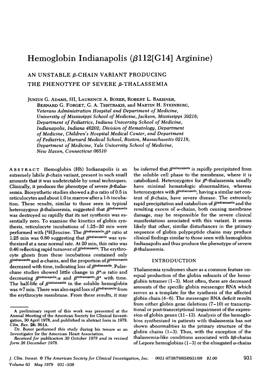 Hemoglobin (Hb) Indianapolis is an extremely labile beta-chain variant, present in such small amounts that it was undetectable by usual techniques. Clinically, it produces the phenotype of severe beta-thalassemia. Biosynthetic studies showed a beta:alpha ratio of 0.5 in reticulocytes and about 1.0 in marrow after a 1-h incubation. These results, similar to those seen in typical heterozygous beta-thalassemia, suggested that betaIndianapolis was destroyed so rapidly that its net synthesis was essentially zero. To examine the kinetics of globin synthesis, reticulocyte incubations of 1.25--20 min were performed with [3H]leucine. The betaIndianapolis:beta A ratio at 1.25 min was 0.80 suggesting that beta Indianapolis was synthesized at a near normal rate. At 20 min, this ratio was 0.46 reflecting rapid turnover of beta Indianapolis. The erythrocyte ghosts from these incubations contained only betaIndianapolis and alpha-chains, and the proportion of betaIndianapolis decreased with time, indicating loss of betaIndianapolis. Pulse-chase studies showed little change in beta A:alpha ratio and decreasing betaIndianapolis:alpha and betaIndianapolis:beta A with time. The half-life of betaIndianapolis in the soluble hemoglobin was approximately equal to 7 min. There was also rapid loss of beta Indianapolis from the erythrocyte membrane. From these results, it may be inferred that betaIndianapolis is rapidly precipitated from the soluble cell phase to the membrane, where it is catabolized. Heterozygotes for beta 0-thalassemia usually have minimal hematologic abnormalities, whereas heterozygotes with betaIndianapolis, having a similar net content of beta-chain, have severe disease. The extremely rapid precipitation and catabolism of betaIndianapolis and the resulting excess of alpha-chains, both causing membrane damage, may be responsible for the severe clinical manifestations associated with this variant. It seems likely that other, similar disturbances in the primary sequence of globin polypeptide chains may produce clinical findings similar to those seen with hemoglobin Indianapolis and thus produce the phenotype of severe beta-thalassemia.