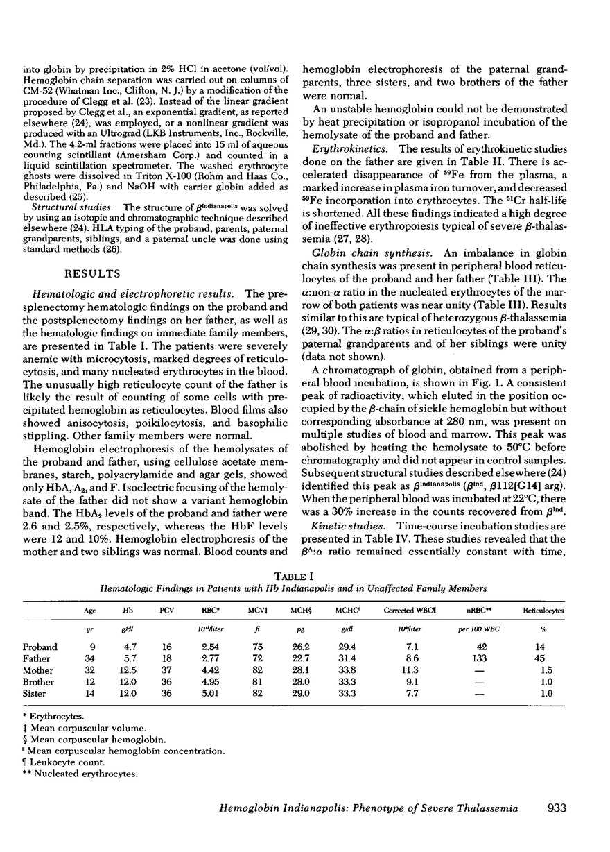 Hemoglobin (Hb) Indianapolis is an extremely labile beta-chain variant, present in such small amounts that it was undetectable by usual techniques. Clinically, it produces the phenotype of severe beta-thalassemia. Biosynthetic studies showed a beta:alpha ratio of 0.5 in reticulocytes and about 1.0 in marrow after a 1-h incubation. These results, similar to those seen in typical heterozygous beta-thalassemia, suggested that betaIndianapolis was destroyed so rapidly that its net synthesis was essentially zero. To examine the kinetics of globin synthesis, reticulocyte incubations of 1.25--20 min were performed with [3H]leucine. The betaIndianapolis:beta A ratio at 1.25 min was 0.80 suggesting that beta Indianapolis was synthesized at a near normal rate. At 20 min, this ratio was 0.46 reflecting rapid turnover of beta Indianapolis. The erythrocyte ghosts from these incubations contained only betaIndianapolis and alpha-chains, and the proportion of betaIndianapolis decreased with time, indicating loss of betaIndianapolis. Pulse-chase studies showed little change in beta A:alpha ratio and decreasing betaIndianapolis:alpha and betaIndianapolis:beta A with time. The half-life of betaIndianapolis in the soluble hemoglobin was approximately equal to 7 min. There was also rapid loss of beta Indianapolis from the erythrocyte membrane. From these results, it may be inferred that betaIndianapolis is rapidly precipitated from the soluble cell phase to the membrane, where it is catabolized. Heterozygotes for beta 0-thalassemia usually have minimal hematologic abnormalities, whereas heterozygotes with betaIndianapolis, having a similar net content of beta-chain, have severe disease. The extremely rapid precipitation and catabolism of betaIndianapolis and the resulting excess of alpha-chains, both causing membrane damage, may be responsible for the severe clinical manifestations associated with this variant. It seems likely that other, similar disturbances in the primary sequence of globin polypeptide chains may produce clinical findings similar to those seen with hemoglobin Indianapolis and thus produce the phenotype of severe beta-thalassemia.
