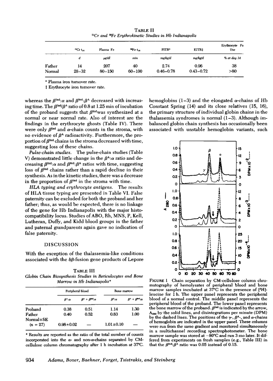 Hemoglobin (Hb) Indianapolis is an extremely labile beta-chain variant, present in such small amounts that it was undetectable by usual techniques. Clinically, it produces the phenotype of severe beta-thalassemia. Biosynthetic studies showed a beta:alpha ratio of 0.5 in reticulocytes and about 1.0 in marrow after a 1-h incubation. These results, similar to those seen in typical heterozygous beta-thalassemia, suggested that betaIndianapolis was destroyed so rapidly that its net synthesis was essentially zero. To examine the kinetics of globin synthesis, reticulocyte incubations of 1.25--20 min were performed with [3H]leucine. The betaIndianapolis:beta A ratio at 1.25 min was 0.80 suggesting that beta Indianapolis was synthesized at a near normal rate. At 20 min, this ratio was 0.46 reflecting rapid turnover of beta Indianapolis. The erythrocyte ghosts from these incubations contained only betaIndianapolis and alpha-chains, and the proportion of betaIndianapolis decreased with time, indicating loss of betaIndianapolis. Pulse-chase studies showed little change in beta A:alpha ratio and decreasing betaIndianapolis:alpha and betaIndianapolis:beta A with time. The half-life of betaIndianapolis in the soluble hemoglobin was approximately equal to 7 min. There was also rapid loss of beta Indianapolis from the erythrocyte membrane. From these results, it may be inferred that betaIndianapolis is rapidly precipitated from the soluble cell phase to the membrane, where it is catabolized. Heterozygotes for beta 0-thalassemia usually have minimal hematologic abnormalities, whereas heterozygotes with betaIndianapolis, having a similar net content of beta-chain, have severe disease. The extremely rapid precipitation and catabolism of betaIndianapolis and the resulting excess of alpha-chains, both causing membrane damage, may be responsible for the severe clinical manifestations associated with this variant. It seems likely that other, similar disturbances in the primary sequence of globin polypeptide chains may produce clinical findings similar to those seen with hemoglobin Indianapolis and thus produce the phenotype of severe beta-thalassemia.