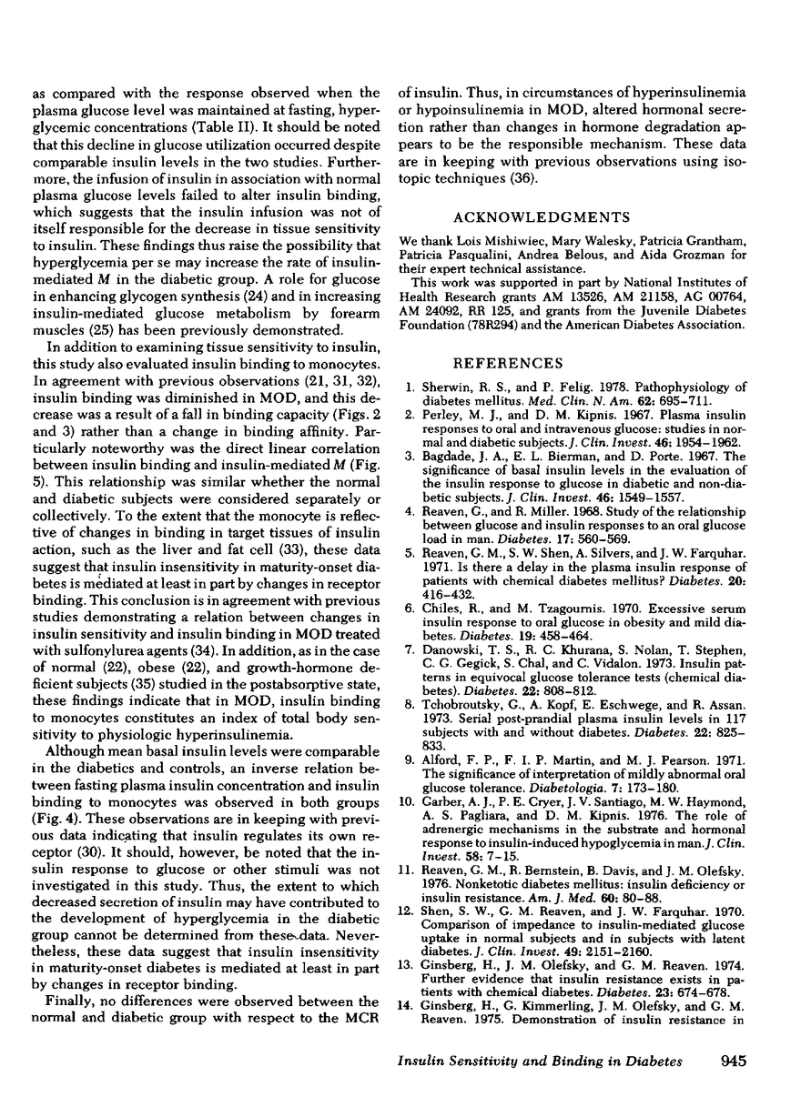 Tissue sensitive to insulin and insulin binding to monocytes were evaluated in 15 nonobese maturity-onset diabetics and in 16 healthy controls. Insulin sensitivity was determined by the insulin clamp technique in which the plasma insulin is acutely raised and maintained 100 μU/ml above the fasting level and plasma glucose is held constant at fasting levels by a variable glucose infusion. The amount of glucose infused is a measure of overall tissue sensitivity to insulin.