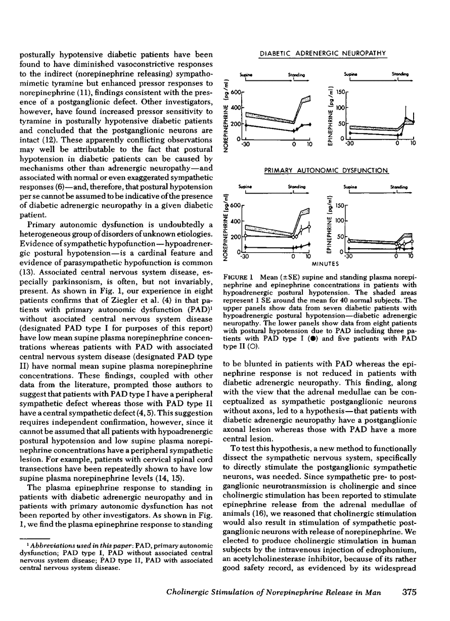 Amplification of endogenous cholinergic activity—produced by the intravenous injection of edrophonium, an acetylcholinesterase inhibitor which does not enter the central nervous system, into normal subjects—resulted in significant and briefly sustained increments in the plasma concentrations of norepinephrine (153±15−234±29 pg/ml, P < 0.01) and epinephrine (16±3−34±5 pg/ml, P < 0.01) measured with a single-isotope derivative method. These increments were not attributable to reflex responses to hemodynamic changes and similar increments in plasma norepinephrine occurred in adrenalectomized (epinephrine deficient) patients. Thus, cholinergic activation results in direct stimulation of sympathetic postganglionic neurons, with augmented norepinephrine release, and of the adrenal medullae, with augmented epinephrine release, in man. Four diabetic patients with hypoadrenergic postural hypotension exhibited blunted sympathetic postganglionic neural responses, and normal adrenomedullary responses, to cholinergic stimulation (and to standing) indicative of the presence of a sympathetic postganglionic axonal lesion in diabetic adrenergic neuropathy. Nondiabetic patients with hypoadrenergic postural hypotension due to documented or probable central nervous system lesions exhibited normal responses to cholinergic stimulation produced in this fashion demonstrating the presence of intact sympathetic postganglionic neurons and adrenal medullae in these patients and providing further support for the conceptual soundness of this approach to the study of human adrenergic physiology and pathophysiology.