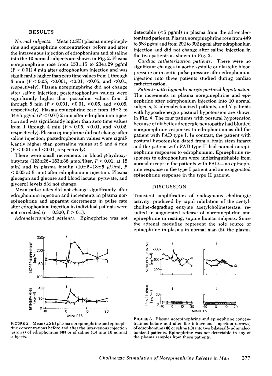 Amplification of endogenous cholinergic activity—produced by the intravenous injection of edrophonium, an acetylcholinesterase inhibitor which does not enter the central nervous system, into normal subjects—resulted in significant and briefly sustained increments in the plasma concentrations of norepinephrine (153±15−234±29 pg/ml, P < 0.01) and epinephrine (16±3−34±5 pg/ml, P < 0.01) measured with a single-isotope derivative method. These increments were not attributable to reflex responses to hemodynamic changes and similar increments in plasma norepinephrine occurred in adrenalectomized (epinephrine deficient) patients. Thus, cholinergic activation results in direct stimulation of sympathetic postganglionic neurons, with augmented norepinephrine release, and of the adrenal medullae, with augmented epinephrine release, in man. Four diabetic patients with hypoadrenergic postural hypotension exhibited blunted sympathetic postganglionic neural responses, and normal adrenomedullary responses, to cholinergic stimulation (and to standing) indicative of the presence of a sympathetic postganglionic axonal lesion in diabetic adrenergic neuropathy. Nondiabetic patients with hypoadrenergic postural hypotension due to documented or probable central nervous system lesions exhibited normal responses to cholinergic stimulation produced in this fashion demonstrating the presence of intact sympathetic postganglionic neurons and adrenal medullae in these patients and providing further support for the conceptual soundness of this approach to the study of human adrenergic physiology and pathophysiology.