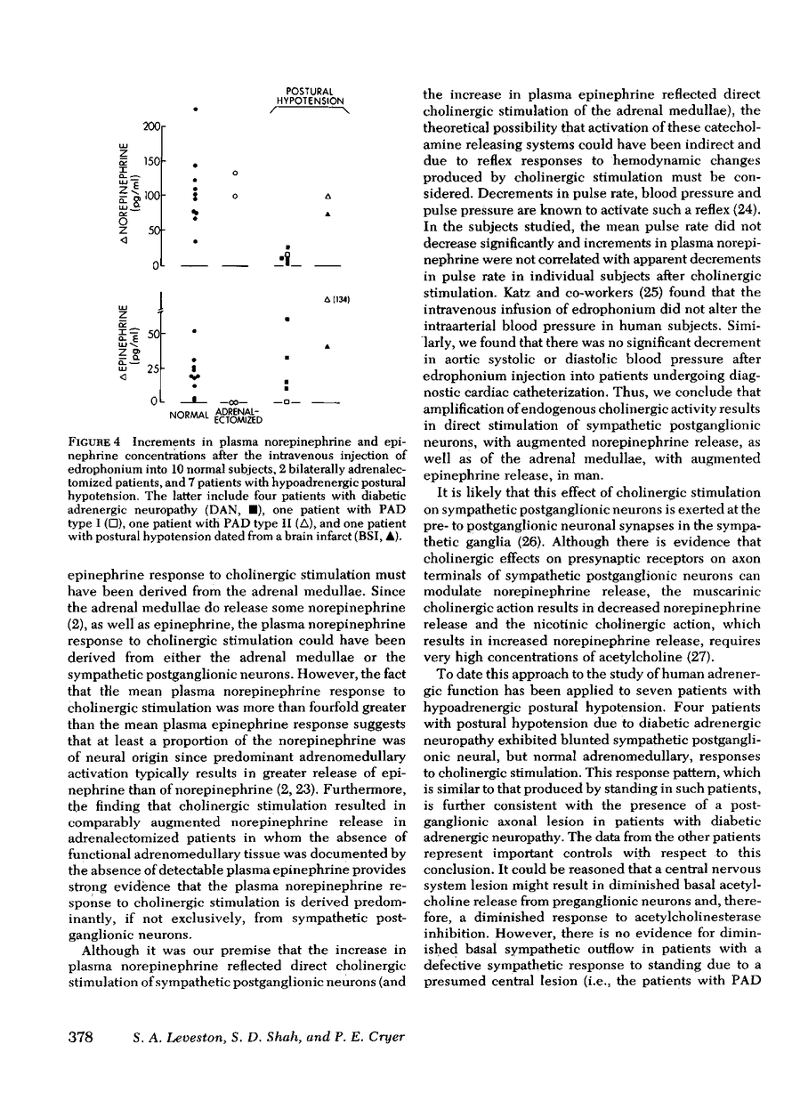 Amplification of endogenous cholinergic activity—produced by the intravenous injection of edrophonium, an acetylcholinesterase inhibitor which does not enter the central nervous system, into normal subjects—resulted in significant and briefly sustained increments in the plasma concentrations of norepinephrine (153±15−234±29 pg/ml, P < 0.01) and epinephrine (16±3−34±5 pg/ml, P < 0.01) measured with a single-isotope derivative method. These increments were not attributable to reflex responses to hemodynamic changes and similar increments in plasma norepinephrine occurred in adrenalectomized (epinephrine deficient) patients. Thus, cholinergic activation results in direct stimulation of sympathetic postganglionic neurons, with augmented norepinephrine release, and of the adrenal medullae, with augmented epinephrine release, in man. Four diabetic patients with hypoadrenergic postural hypotension exhibited blunted sympathetic postganglionic neural responses, and normal adrenomedullary responses, to cholinergic stimulation (and to standing) indicative of the presence of a sympathetic postganglionic axonal lesion in diabetic adrenergic neuropathy. Nondiabetic patients with hypoadrenergic postural hypotension due to documented or probable central nervous system lesions exhibited normal responses to cholinergic stimulation produced in this fashion demonstrating the presence of intact sympathetic postganglionic neurons and adrenal medullae in these patients and providing further support for the conceptual soundness of this approach to the study of human adrenergic physiology and pathophysiology.