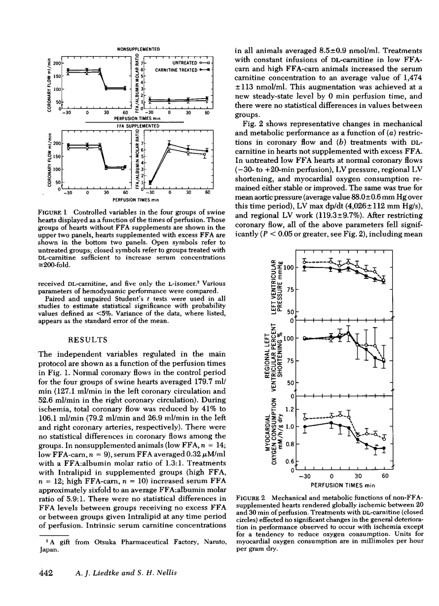 Free fatty acids (FFA) in excess FFA: albumin molar ratios have been determined to additionally compromise mechanical performance in ischemic hearts. Carnitine, an intracellular carrier of FFA and an agent which is lost to the heart during ischemia, has been postulated to in part restore function with its replacement. To test whether its benefits are also operative in a setting of excess FFA, these studies were performed. In the main protocol, four groups of perfused swine hearts (n = 45) were compared during 50 min of control flow (179.7 ml/min) and 40 min of global ischemia (106.1 ml/min). Initial base-line serum FFA:albumin molar ratios and carnitine levels in all groups were 1.3:1 and 8.5 nmol/ml, respectively. In two of these groups FFA:albumin ratios were increased to 5.9:1 with constant infusions of Intralipid. In two alternate groups (one with and one without extra FFA supplements) dl-carnitine was supplied, sufficient to increase serum levels nearly 200-fold. Ischemia per se in 14 hearts significantly decreased several parameters of global and regional mechanical function including left ventricular (LV) and mean aortic pressures, LV isovolumetric pressure development (max dp/dt), LV epicardial motion, and LV work, together with concomitant decreases in myocardial oxygen consumption. Elevated FFA in 12 hearts rendered similarly ischemic further decreased mechanical function (LV pressure: −20.8%, P < 0.05; mean aortic pressure −26.9%, P < 0.05; LV max dp/dt: −39%, P < 0.05; regional LV shortening: −51.1%, P < 0.05; and LV work: −50.3%, P < 0.05) as compared with nonsupplemented hearts. dl-Carnitine treatments in nine hearts, not supplemented with extra FFA were without apparent effect in improving overall hemodynamic performance. However, dl-carnitine in 10 high FFA-ischemic hearts effected several improvements as compared with the untreated group: LV pressure was increased 25.6%, P < 0.025; mean aortic pressure: +43.5%, P < 0.05; LV max dp/dt: +41.5%, P < 0.05; regional LV shortening: +241.3%, P < 0.001; and LV work: +76.2%, P < 0.05 at comparable levels of myocardial oxygen consumption. In a separate protocol, the effects of stereospecificity were also studied by comparing l- with dl-carnitine in globally perfused, palmitate-supplemented hearts (five hearts in each treatment group). At similar conditions of flow and serum FFA, changes in mechanical function were comparable, except for a tendency to perform greater LV work at reduced flows in the l-carnitine-treated hearts. Thus, it was demonstrated that carnitine in ischemic hearts is capable of preserving mechanical function under conditions of excess FFA, presumably by modifying the toxic effects of FFA intermediates. The major therapeutic actions appeared to derive from the l-isomer of carnitine.